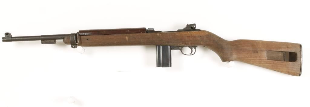 Semi auto military carbine with 18" barrel. Parkerized finish, plain wood stock with upper handguard, shrouded front sight, adjustable rear aperture sight and bayonet lug. Good bore and action. Includes 1 magazine. Condition: Fair to good showing little finish remaining on wood and metal is good. *Curio & Relic Firearm*