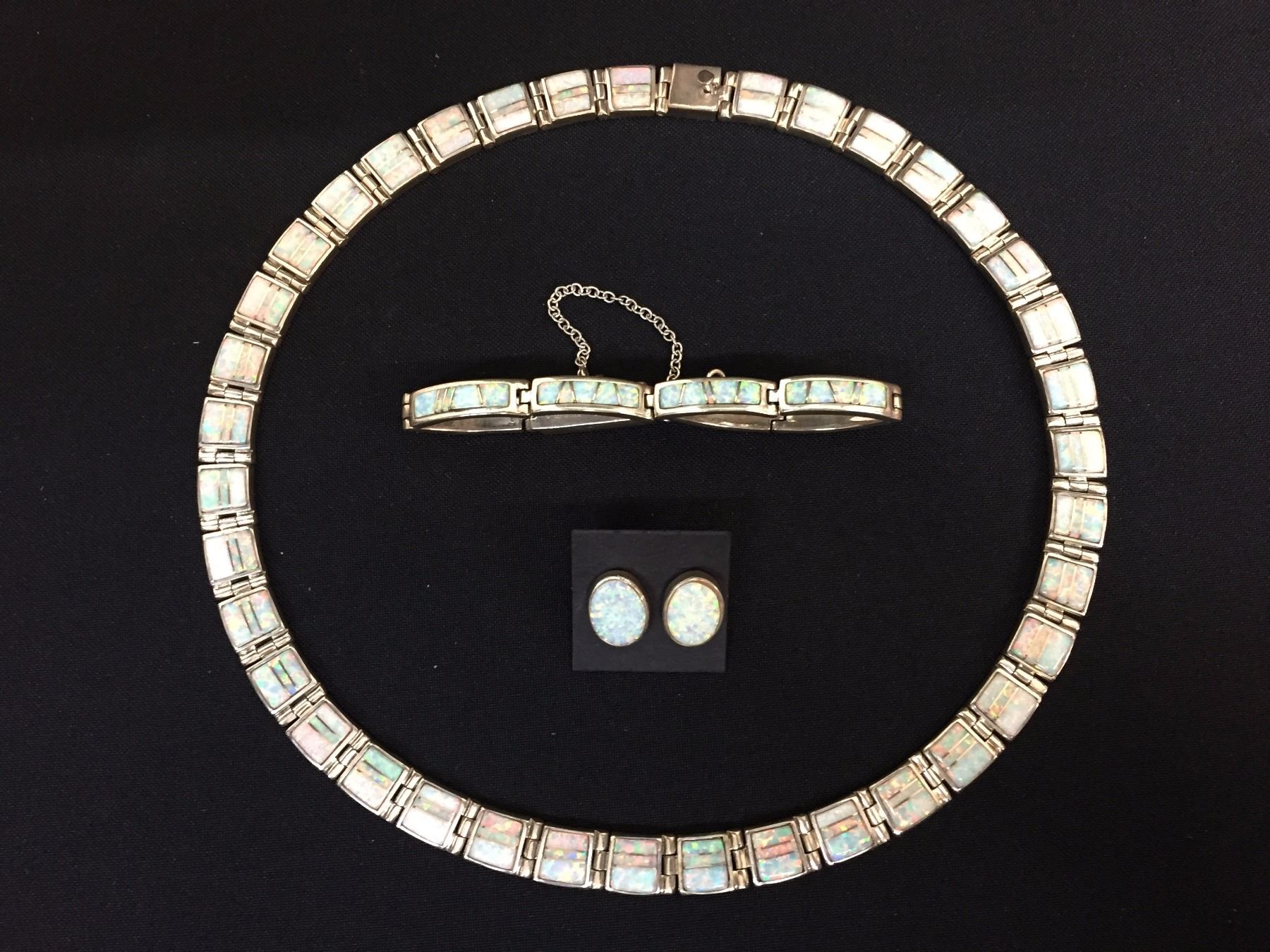 Description: 3 piece inlay matching set. Maker: Hallmarked, TSF. Approx. Age: Fairly contemporary. Size: 12” around the neck. Bracelet is 7 1/2” l. Earrings are 1/2”. Combined weight of 84.0 g. Condition: Good for their age, normal wear expected. Please look closely at the pictures - they are an important part of our description. Shipping: There will be a $5 handling / packaging fee for shipping this lot. The actual cost of postage will be added on top of that.