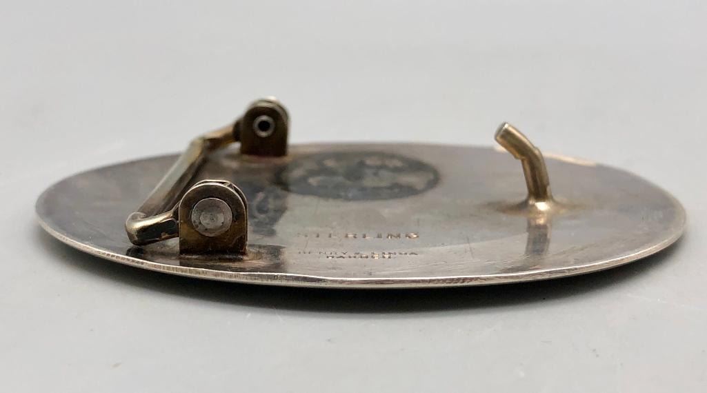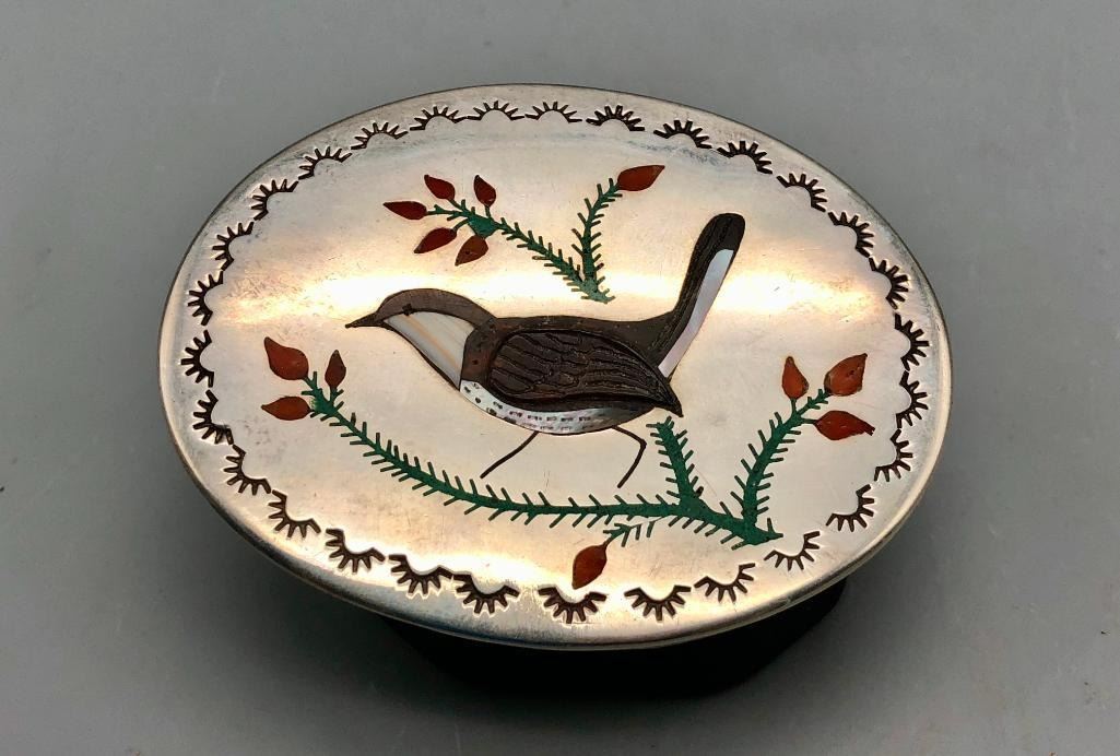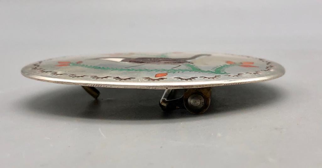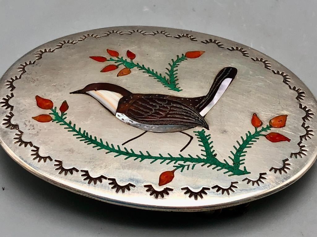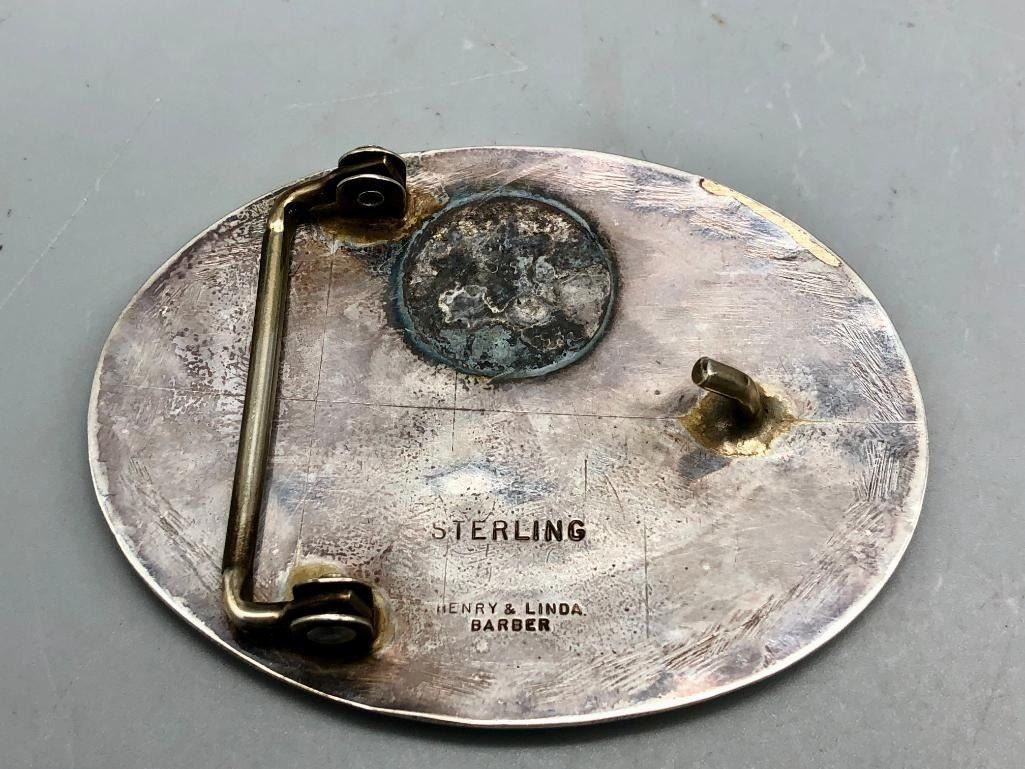 Up for consideration is an inlay belt buckle by Henry and Linda Barber. It features a bird design, set with shell, coral, and other stones. It has hand stamped designs around the edges and it is sterling silver. MAKER: Hallmarked Henry (Navajo) and Linda Barber (?-2002; Navajo). APPROX AGE: Circa 1970s. SIZE: 2-7/8 inches wide X 2-1/4 inches tall. Fits a 1-3/8 inch belt. Weighs 44.1 grams. CONDITION: Good for its age, normal wear expected. Please look closely at the pictures as they are an important part of our description and are hereby incorporated into the description, specifically with regards to condition. SHIPPING: There will be a $5 handling / packaging fee for shipping this lot. The actual cost of postage will be added on top of that. BUY IT NOW: If you would like to buy this item now, without waiting for the auction day to bid on it, we do offer this option (which is available up to 48 hours before the actual auction starts). The “Buy it Now†price is the high estimate of this lot (plus applicable fees and the Buyer's premium is discounted to 10% when using the Buy it Now option). If you would like to exercise this option, you must contact us by email (or phone as long as you talk to someone live). Reference this lot number and your intention to "Buy it Now."