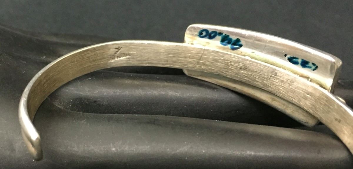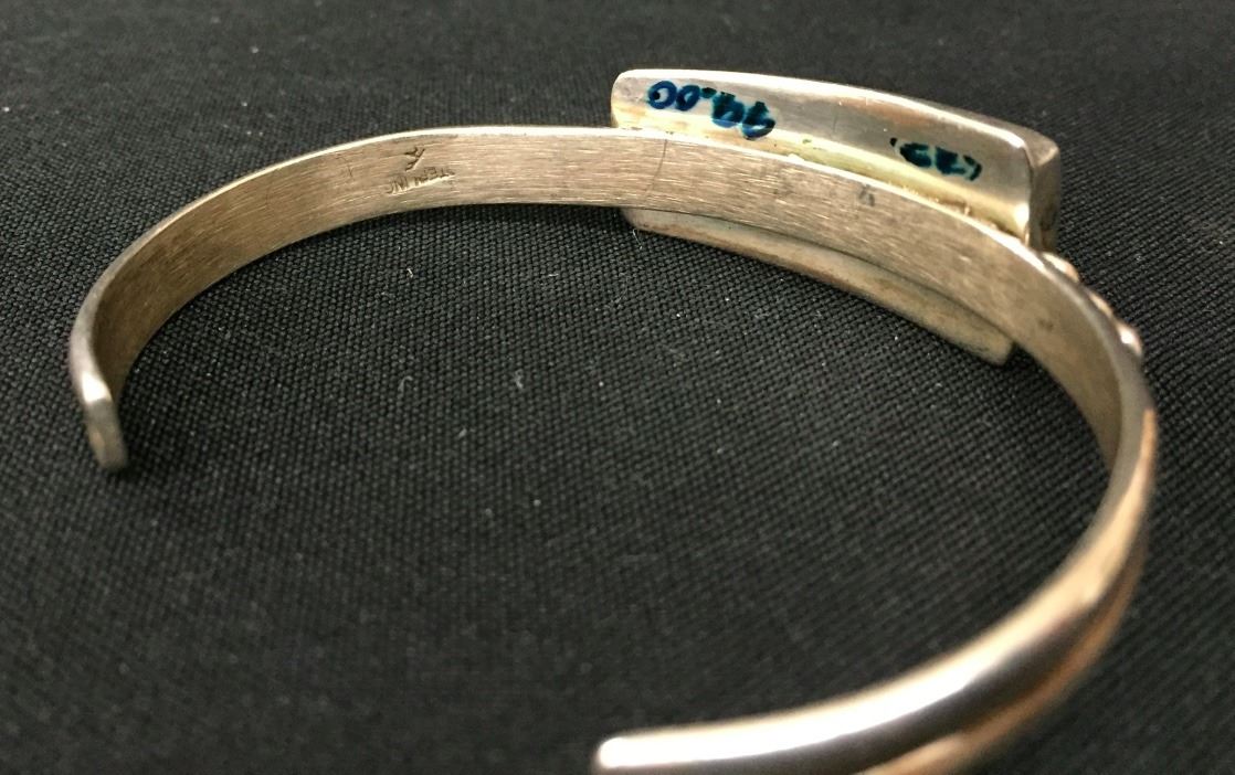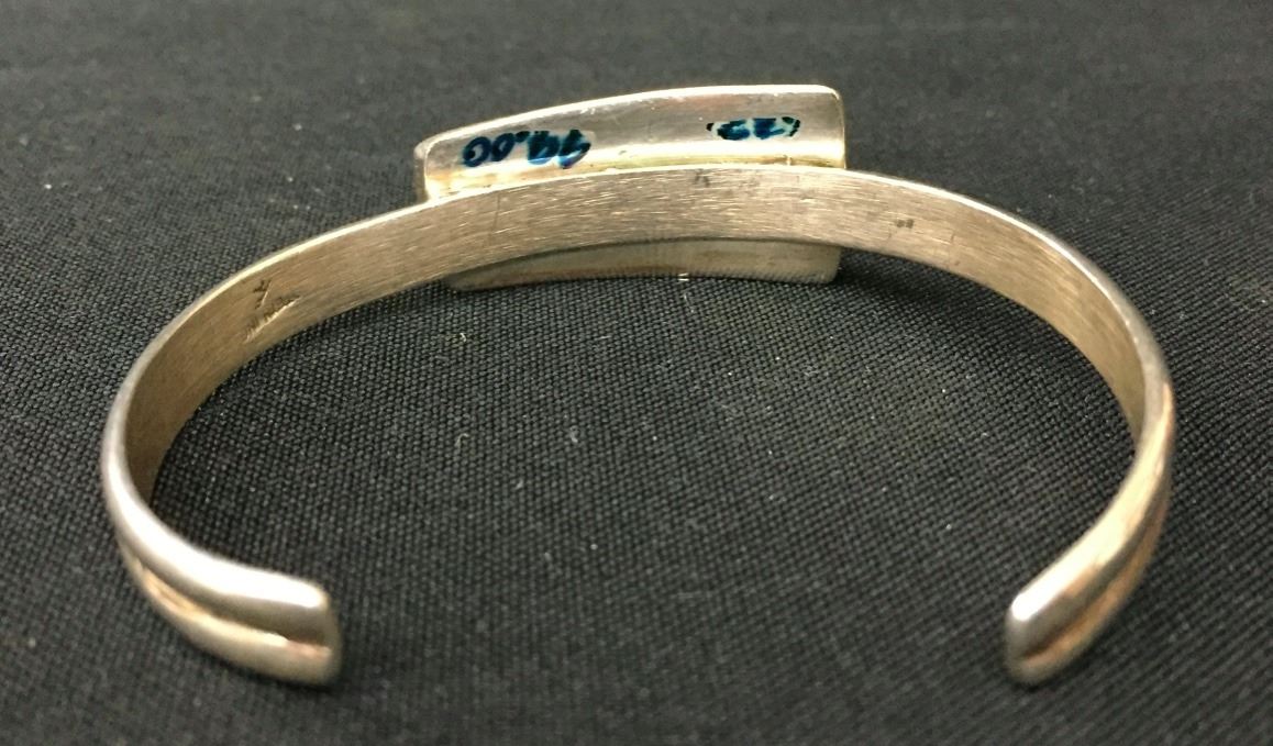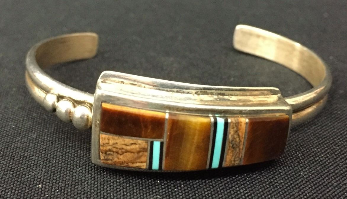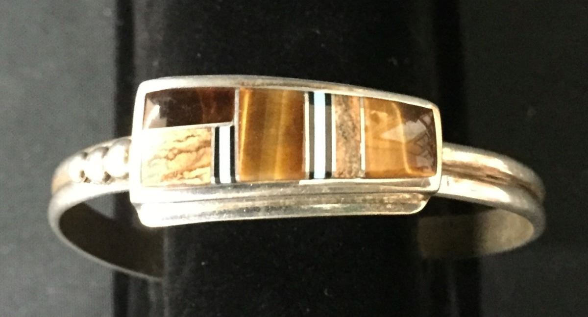 Turquoise, Tigers Eye and Picture Jasper channel inlay. Measures 5” inside plus there is a 1.25” opening. Just over .5 inch at the widest point and weighs 25.5 g. Stamped Sterling and the initials FA (stylized). Please look closely at pics - they are an important part of our description. Shipping: There will be a $5 handling / packaging fee for shipping this lot. The actual cost of postage will be added on top of that.