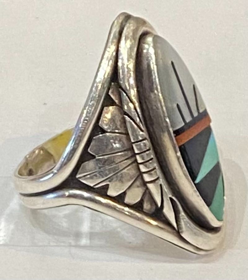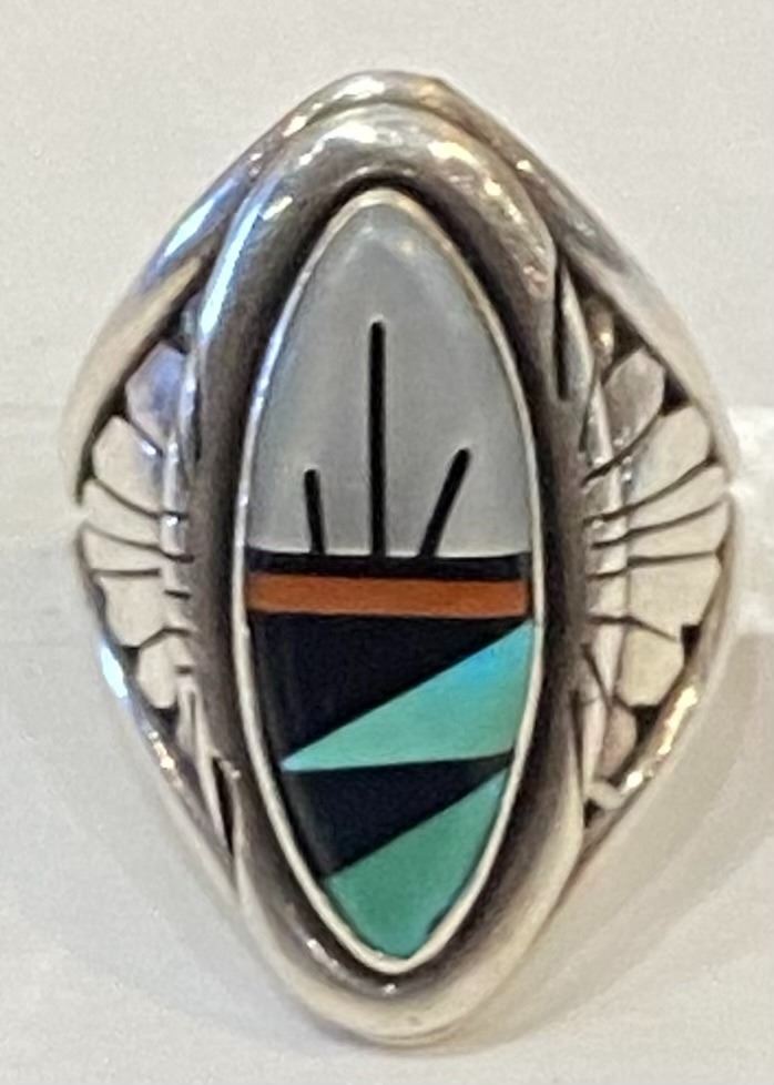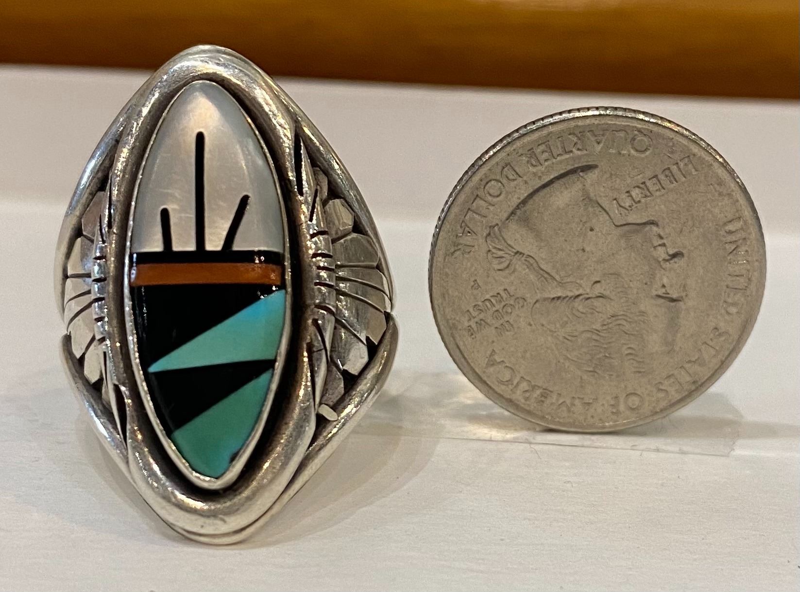 Awesome Zuni Style Multi Stone Ring. Nicely done with Silver Work and Mother of Pearl, Jet, and Turquoise Inlayed in a elegant setting.