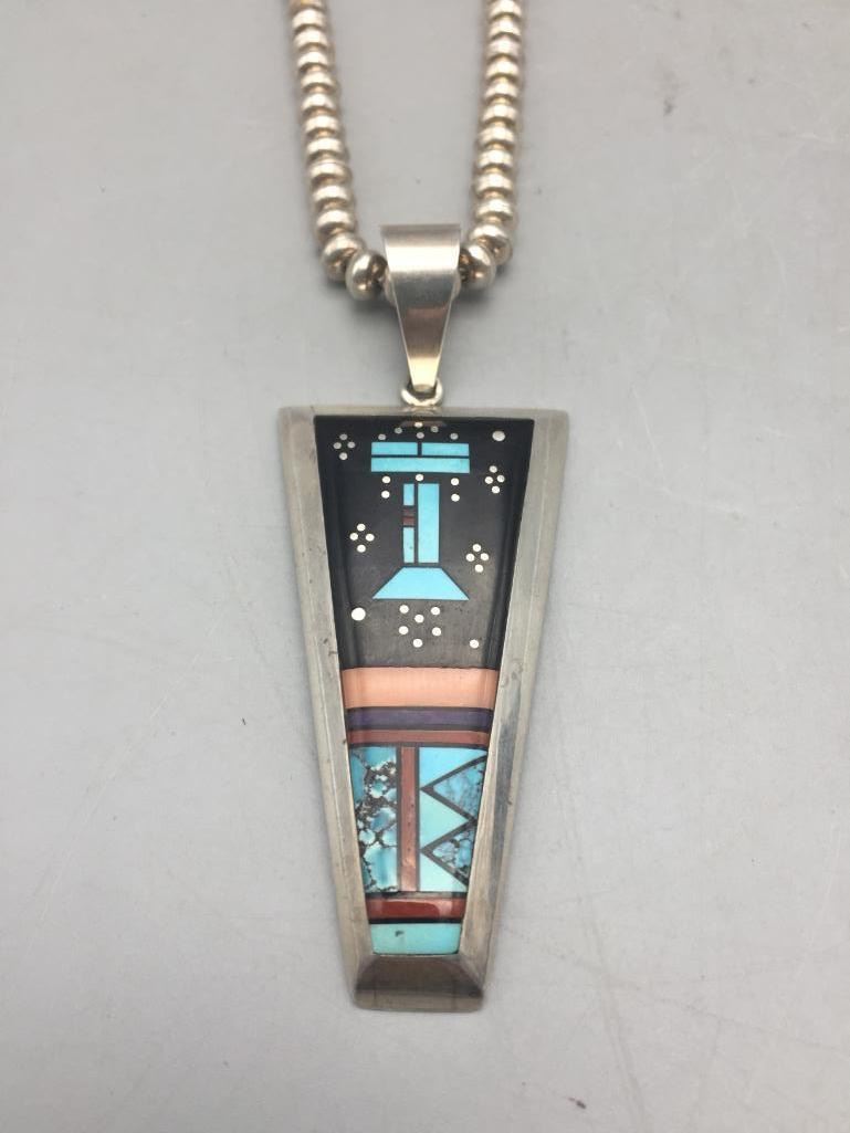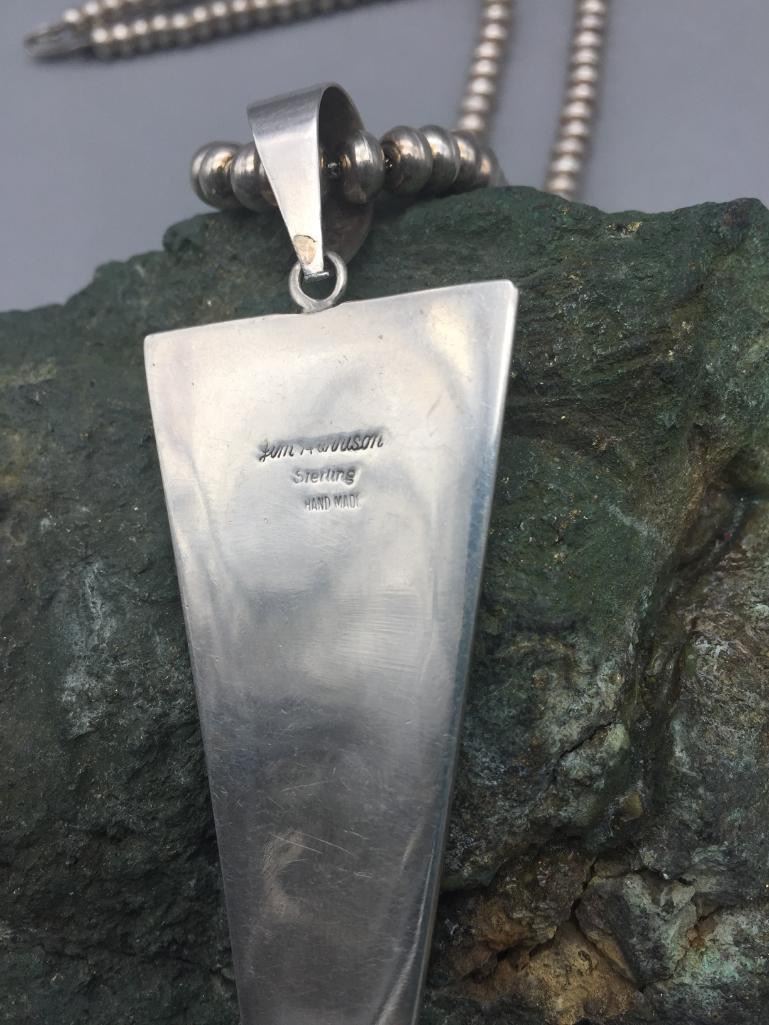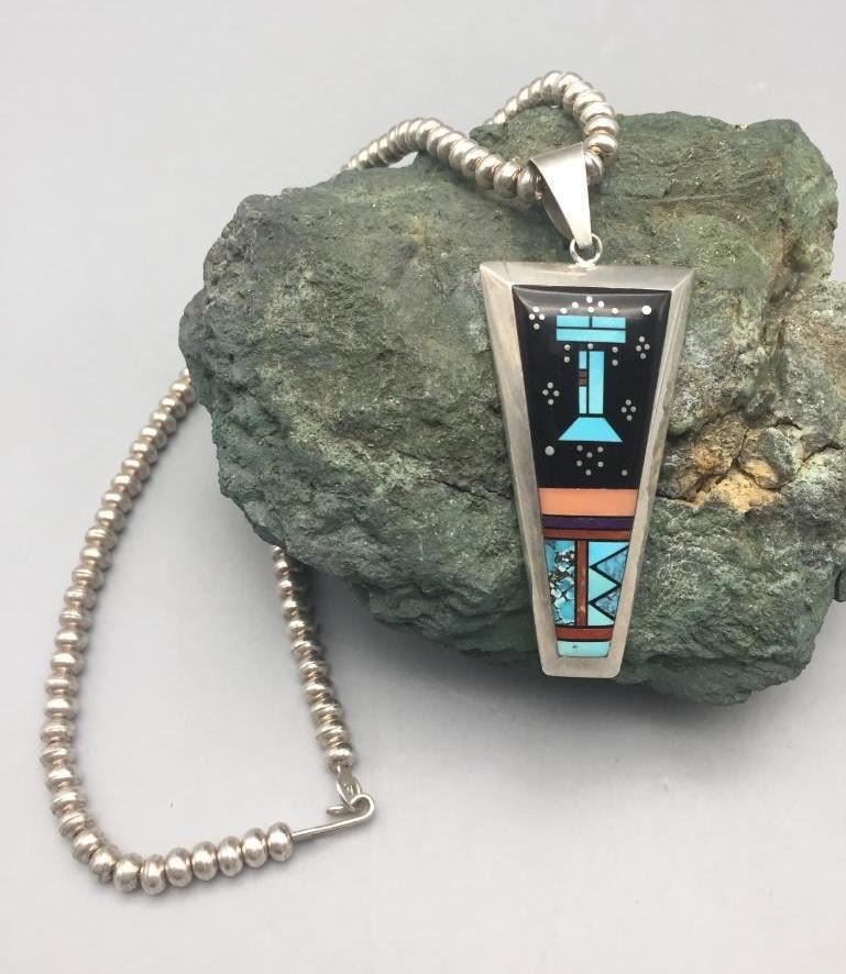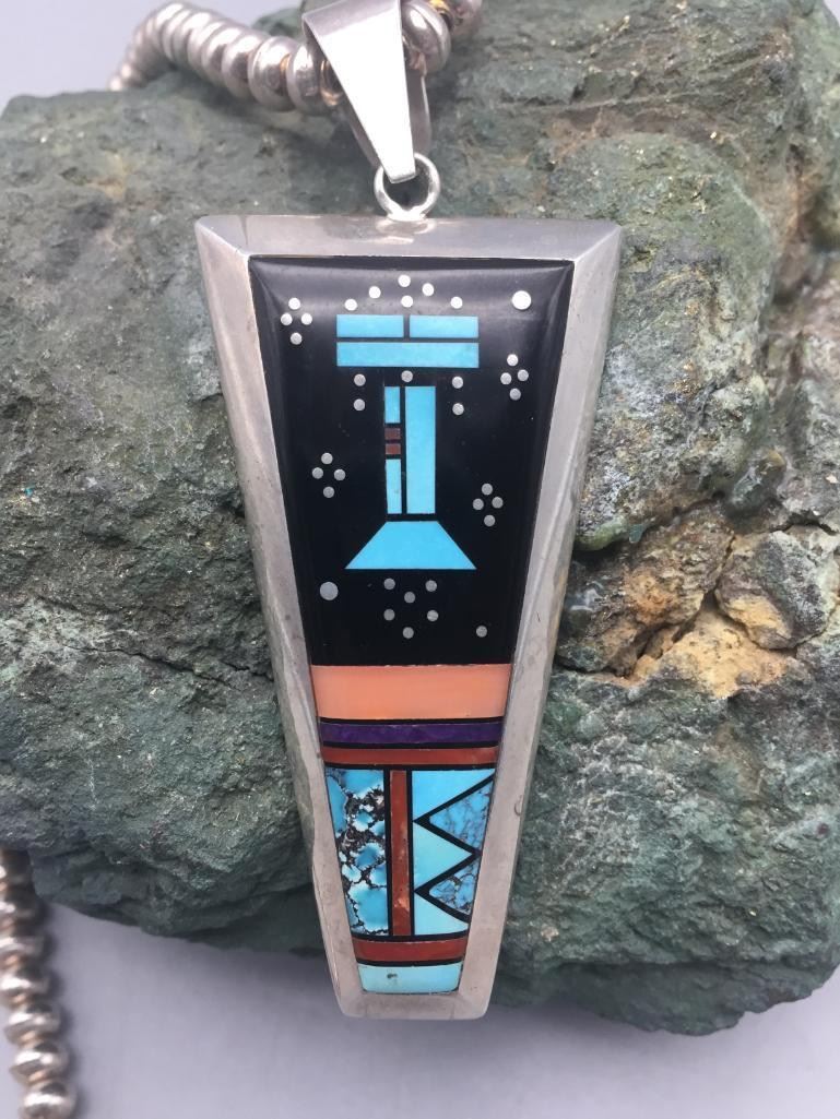 Description: Presented in this lot is a beautiful inlay necklace made by multiple award winning artist Jimmy Harrison. This necklace is set with turquoise, coral, onyx, and other stones. Marked sterling and handmade. Maker: Jimmy Harrison (1952-; Navajo) Active since 1970s. Approx. Age: Fairly Modern. Size: Fits a 19 inch neck. Pendant measures 3-3/8 inches long X 1-1/4 inches wide. Weighs 62.6 grams. Condition: Good for its age, normal wear expected. Please look closely at the pictures - they are an important part of our description. Shipping: There will be a $5 handling / packaging fee for shipping this lot. The actual cost of postage will be added on top of that.