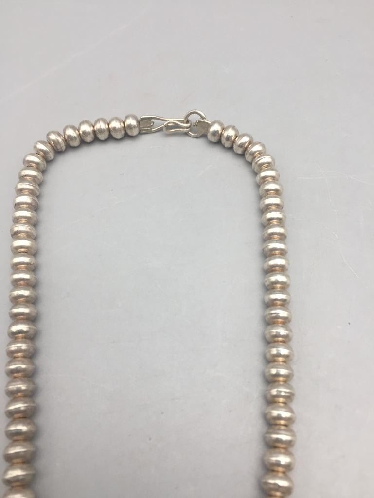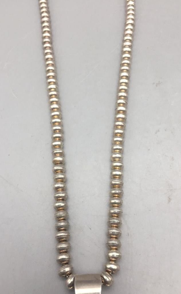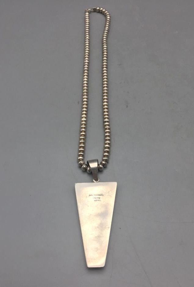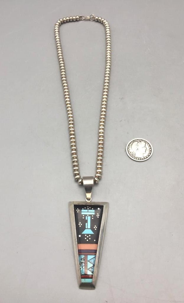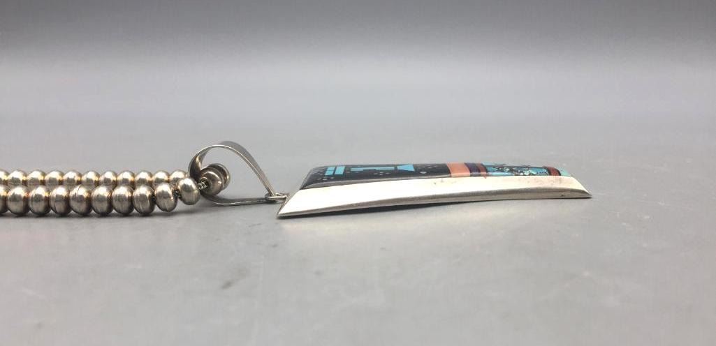 Description: Presented in this lot is a beautiful inlay necklace made by multiple award winning artist Jimmy Harrison. This necklace is set with turquoise, coral, onyx, and other stones. Marked sterling and handmade. Maker: Jimmy Harrison (1952-; Navajo) Active since 1970s. Approx. Age: Fairly Modern. Size: Fits a 19 inch neck. Pendant measures 3-3/8 inches long X 1-1/4 inches wide. Weighs 62.6 grams. Condition: Good for its age, normal wear expected. Please look closely at the pictures - they are an important part of our description. Shipping: There will be a $5 handling / packaging fee for shipping this lot. The actual cost of postage will be added on top of that.