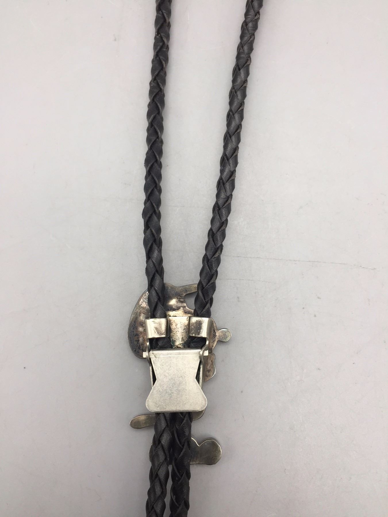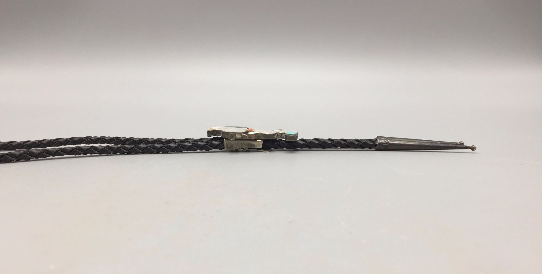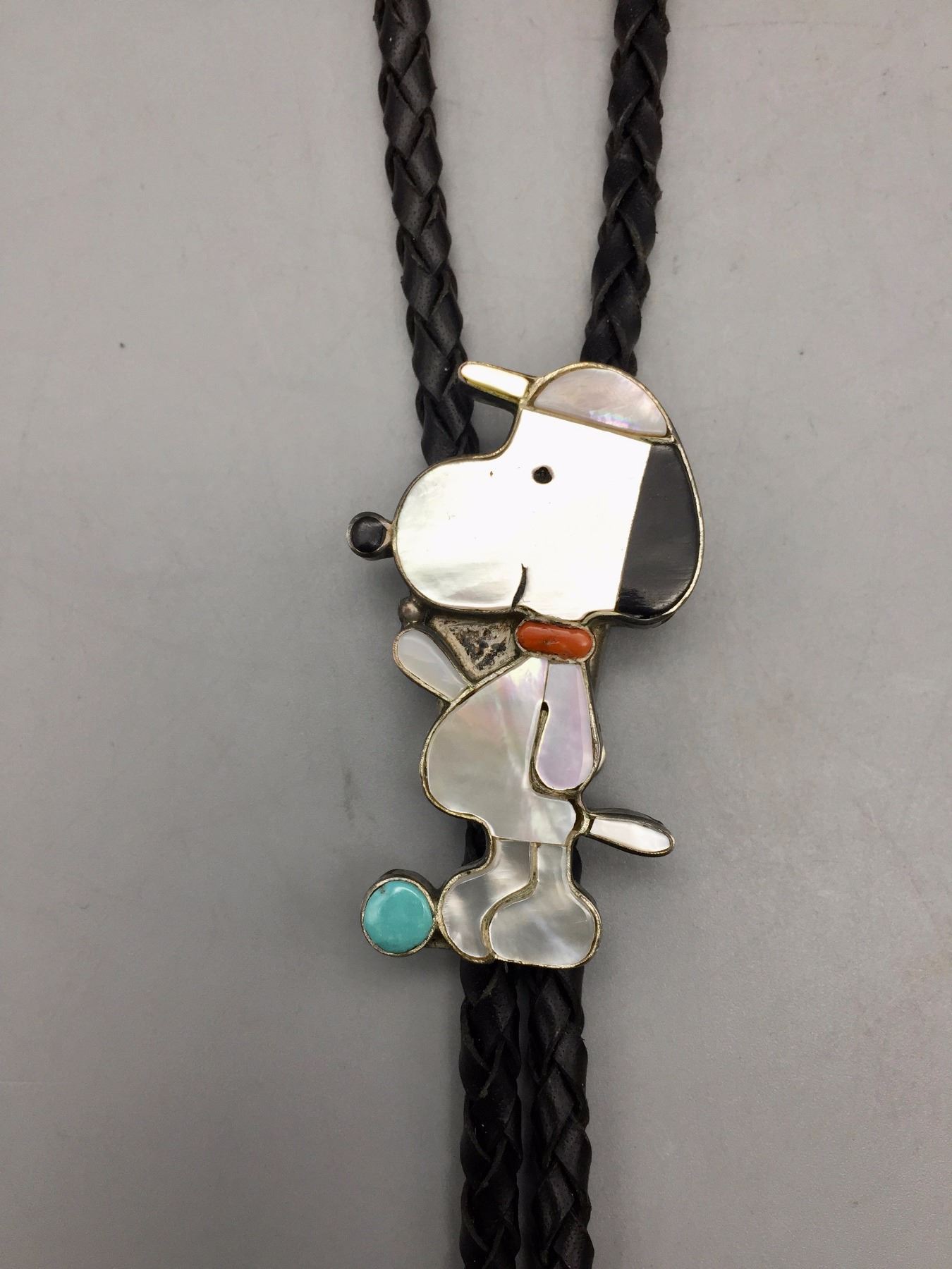 Description: Sterling silver ‘Snoopy’ inlay bolo with mother of pearl, coral, turquoise, etc. with black leather cord and sterling silver cord tips. Maker: No hallmark, but vintage Zuni style. Approx. Age: Vintage. Size: 38” around the neck and slide is 2” l x 1 1/8” w. Weighs 29.6 g. Condition: Good for its age, normal wear expected. Please look closely at the pictures - they are an important part of our description. Shipping: There will be a $5 handling / packaging fee for shipping this lot. The actual cost of postage will be added on top of that.