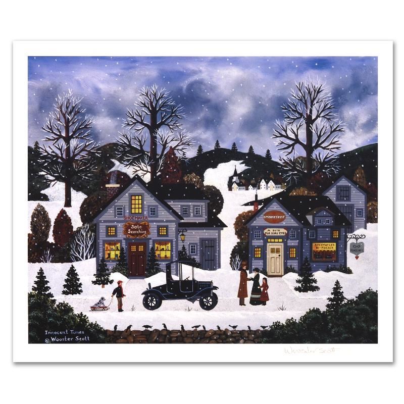 Cozy, down-home images of a bygone era when life was simpler - this is the feeling captured in the creations of one of the world's most recognized artists. "Innocent Times" is a limited edition lithograph on paper, numbered and hand signed by Wooster Scott! Includes Certificate of Authenticity! Measures approx. 17" x 14" (with border), 15" x 12" (image).