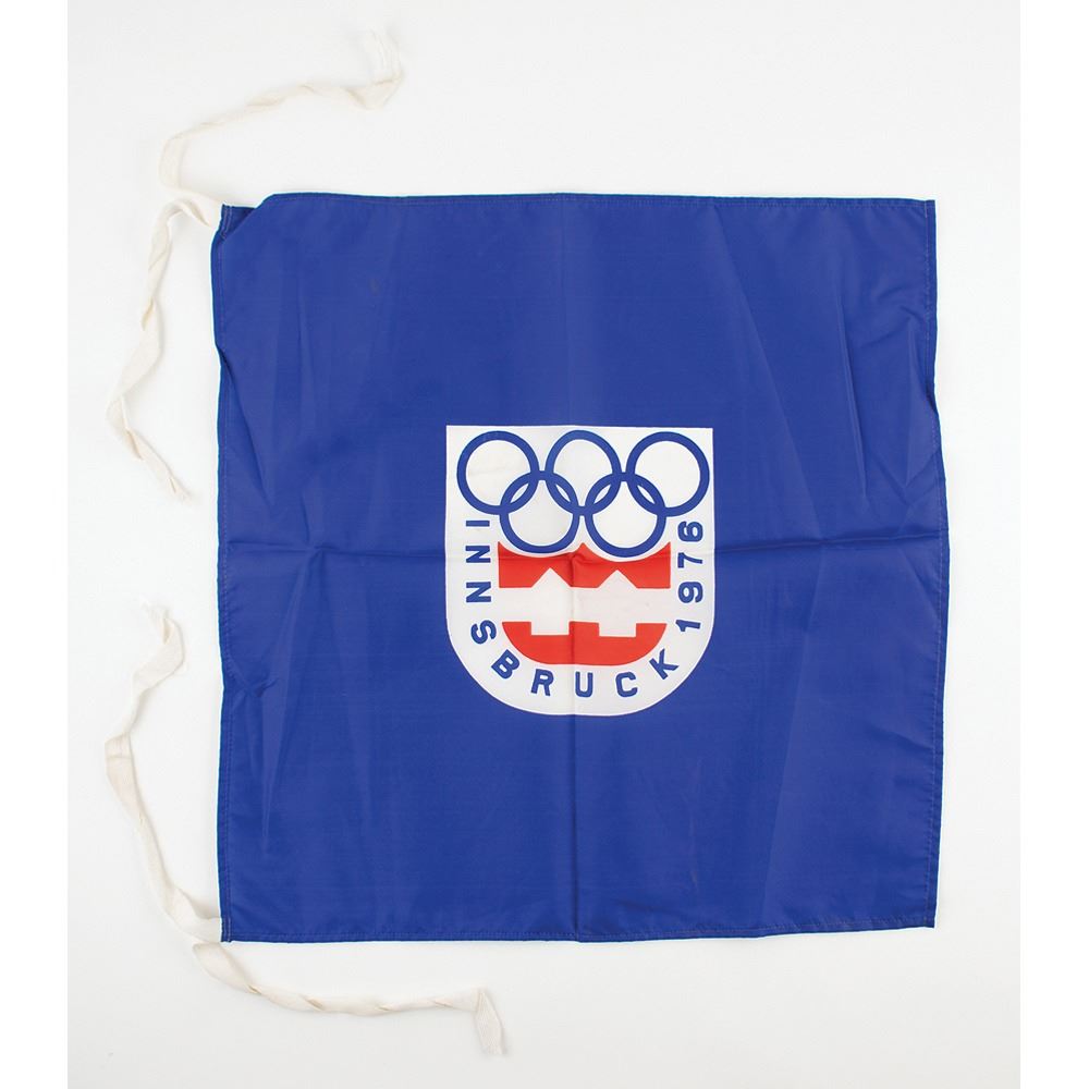 Fabric gate flag from the Innsbruck 1976 Winter Olympics, 16 x 16.5, featuring the emblem of the XII Winter Olympiad against a blue background. In fine, folded condition.
