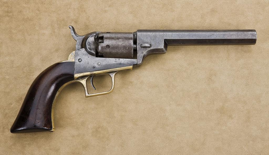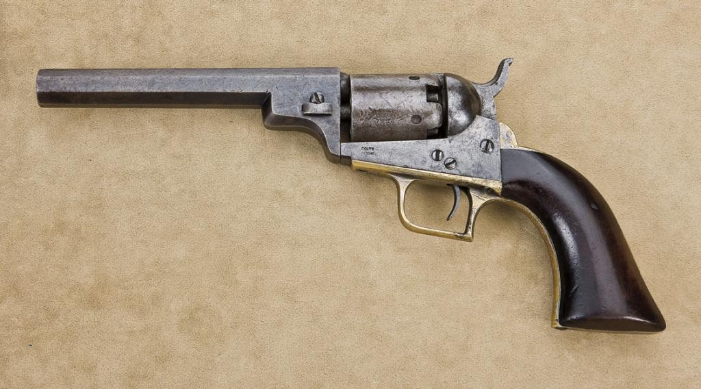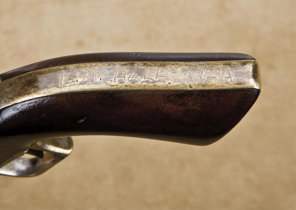 Inscribed Colt Baby Dragoon percussion revolver, .31 cal., 5” octagon barrel, blue and case hardened finish, wood grips, #7215. This gun is in overall good to very good condition showing slight hints of muted blue on the barrel assembly and faint case color on the frame and hammer; the action is good, the bore fair and the markings are clean including matching serial numbers on all major parts including the wedge; much of the cylinder scene is visible and there are scattered old nicks and scratches on the cylinder and barrel from carry and storage; the grips are very good with some knackering on the butts. The back strap is hand inscribed “L. M. Hall 1-A”. A file accompanies this lot with information on Cpl. Levi M. Hall of the 1st Maryland Cavalry, Co. A indicating he was mustered into service on November 11, 1861 and mustered out on June 28, 1865. According to information from the American Civil War Research Database, the 1st MD. Cavalry had a distinguished record and presence at numerous battles including New Market, Virginia; Winchester, Virginia; Antietam, Maryland and Loudon Heights, Virginia. Est.: $7,500-$8,500.