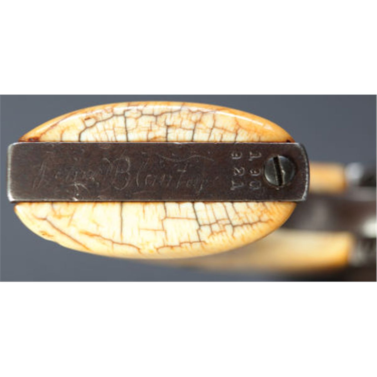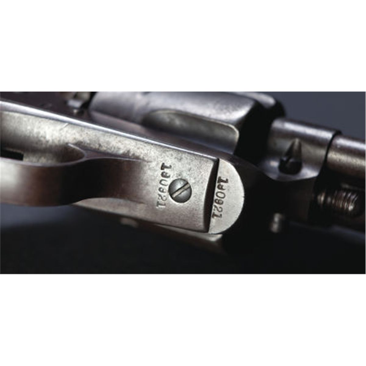 Inscribed Colt Single Action Army Revolver. Serial no. 190921, .45 caliber, 5 1/2-inch barrel with single-line Hartford address. Two-line Colt patent dates. Butt inscribed and backstrap rocker engraved: John Blanton. Period Colt ivory grips with nine notches sawed into back edge of right grip. Sold with Colt factory letter confirming serial number, caliber and blue finish. Grips unlisted. Shipped in a group of 15 guns. Shipped to Simmons Hardware Co., St. Louis, Mo. on November 6, 1899. Condition: Good. Metal with smooth grey-brown age patina with traces of an old refinish in protected areas and minor pitting on gripstrap, frame and cylinder. Inscriptions as described. Grips with mellow age patina. Action tight and crisp.
