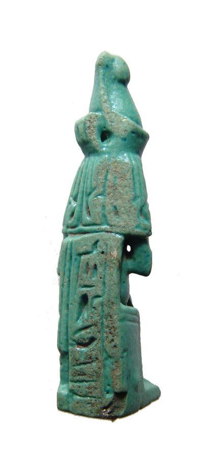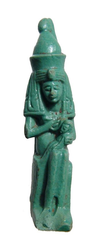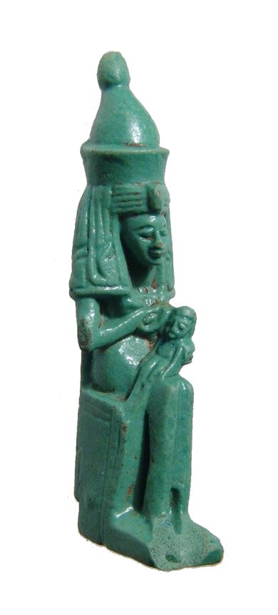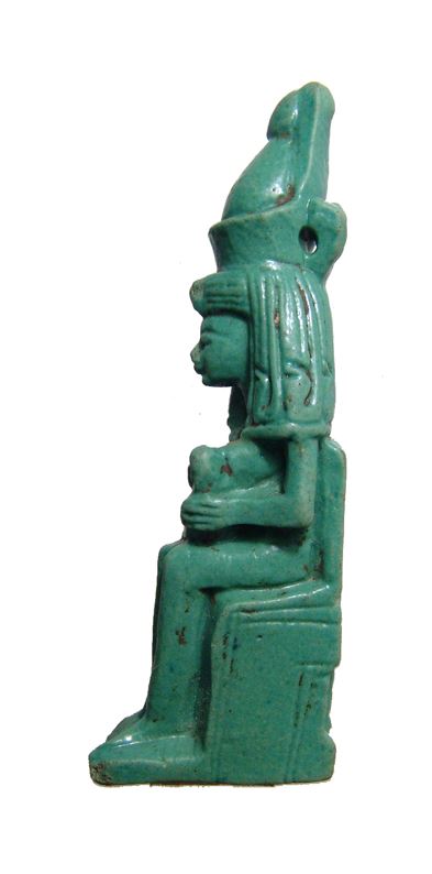 A beautiful inscribed Egyptian blue-green frit amulet of Mut, Late Period, c. 664 - 332 BC, depicted seated on her throne, holding the infant Horus whom she suckles in her lap. She wears a large wig decorated with cobras and a headdress representing Upper and Lower Egypt. The back of the amulet with a vertical column of hieroglyphic text and the amulet is extremely well-preserved with excellent surfaces and brilliant color. H: 2 4/5 in (7.2cm). Ex Tepper Galleries; Ex Brooklyn Heights private estate.