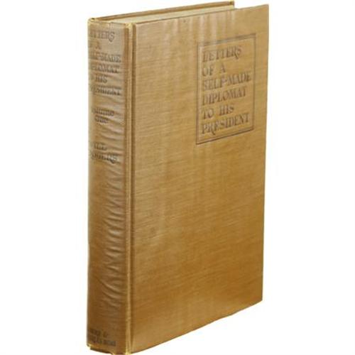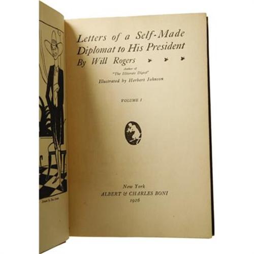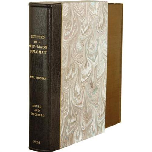 <B>Will Rogers: Inscribed First Edition of: <I>Letters of a Self-Made Diplomat to His President.</B></I></B></I> Volume I. (New York: Albert & Charles Boni, 1926). First edition, inscribed by the author on the front free endpaper: βTo Vera Bloom Daughter of a Real Dad from Will Rogers your friend.β Octavo (7.25β x 5β). Illustrated. Publisher's brown cloth, stamped in dark brown. Slight rippling to the cloth on the covers, newspaper clipping mounted to recto of frontis, else a very good copy. Housed in a slipcase of quarter morocco over marbled paper boards, lettered in gilt on the spine.<BR><BR><b>Shipping:</b> Books & Catalogs (<a target="_blank" href="http://www.heritageauctions.com/common/shipping.php">view shipping information</a>)