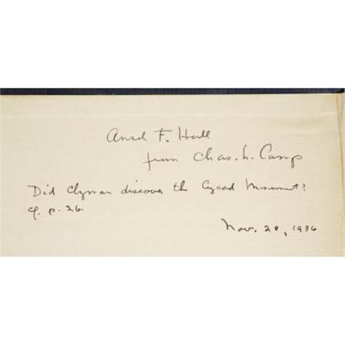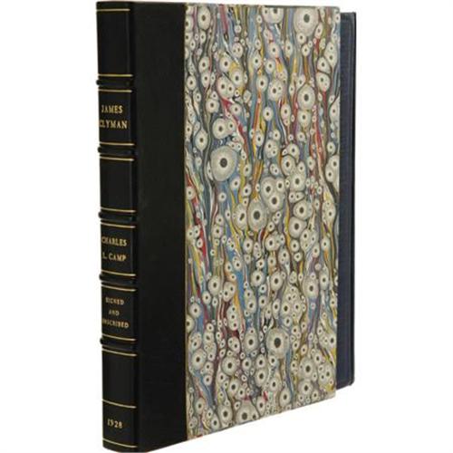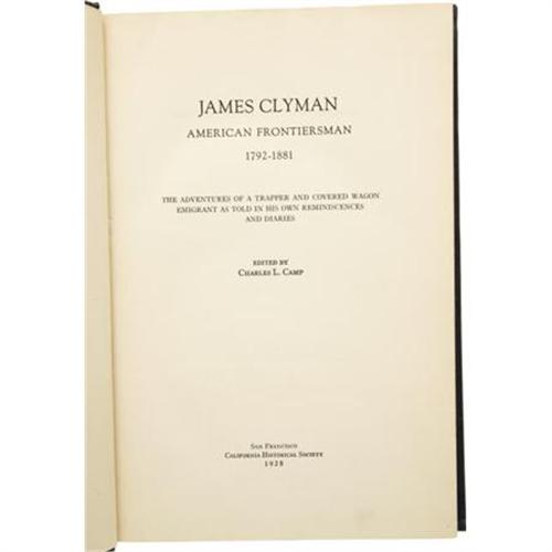 <B> James Clyman Charles L. Camp editor : A Superb Signed and Inscribed Copy of <I>James Clyman, American Frontiersman 1792-1881.</B></I></B></I> The Adventures of a Trapper and Covered Wagon Emigrant as Told in his Own Reminiscences and Diaries. Edited by Charles L. Camp. (San Francisco: California Historical Society, 1928). First edition. Signed and inscribed by the editor on the front pastedown endpaper, and with the recipient's bookplate. Octavo (10” x 6.5”). 247, 4, index pages. Photographic frontispiece portrait of an elderly Clyman, illustrated with a portrait of Hannah Clyman, maps including one folding, and a facsimile page of Clyman's diary. Original blue cloth lettered in gilt. Bottom corner cut from Clyman's frontisportrait, away from the image, else an about fine copy. Housed in custom quarter morocco book-backed slipcase with five raised bands and gilt tooling on the spine.<BR><BR><b>Shipping:</b> Books & Catalogs (<a target="_blank" href="http://www.heritageauctions.com/common/shipping.php">view shipping information</a>)