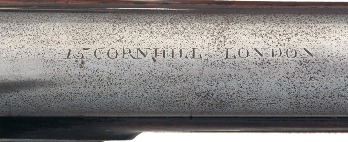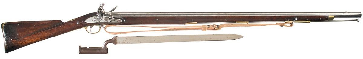 The lock is marked "P BOND" ahead of the hammer and the top of the barrel is marked "45 CORNHILL LONDON" with recessed "crown/GP" and "crown/V" British military proofs present at the breech. All iron parts are bright with brass mountings and iron trumpet head ram rod. Mounted with a full one piece walnut stock with contemporary leather sling. There is an inscribed brass oval on the top of the wrist. The first two lines are"JAMES ?" and the last two read "July 27 / 1805". Complete with an Enfield sword bayonet with a 19 1/4" blade marked "ENFIELD" and "crown/GR".