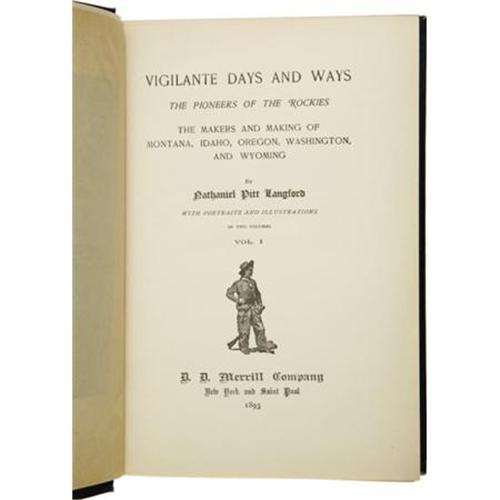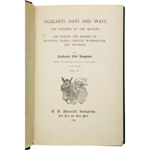 <B>Nathaniel Pitt Langford: Inscribed Twice by the Author in an Excellent Two-Volume Set of <I>Vigilante Days and Ways: The Pioneers of the Rockies.</B></I></B></I> The Makers and Making of Montana, Idaho, Oregon, Washington, and Wyoming. By Nathaniel Pitt Langford. With Portraits and Illustrations. In Two Volumes. (New York and Saint Paul: D.D. Merrill Company, 1893). Second edition, after the scarce first edition of 1890. This copy is inscribed in each volume by the author: “Henry L. Huilster, Compliments of Nathaniel P. Langford. St. Paul Nov. 17, 1900.” Two octavo volumes (7.5” x 5”). Xxvi, 426; xiii, 485 pages. Illustrated. Publisher's blue cloth, lettered in gilt on the spine. Top edges gilt. Very minor rubbing, else a spectacular, fine copy. Housed in a custom quarter morocco book-backed slipcase with four raised bands and gilt tooling on the spine.<BR><BR><b>Shipping:</b> Books & Catalogs (<a target="_blank" href="http://www.heritageauctions.com/common/shipping.php">view shipping information</a>)