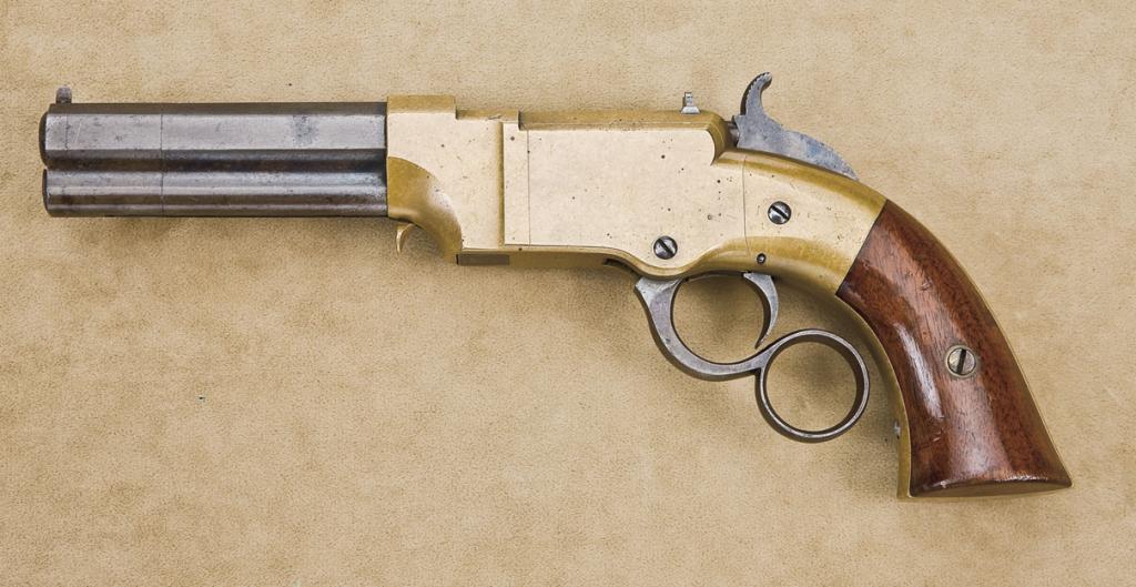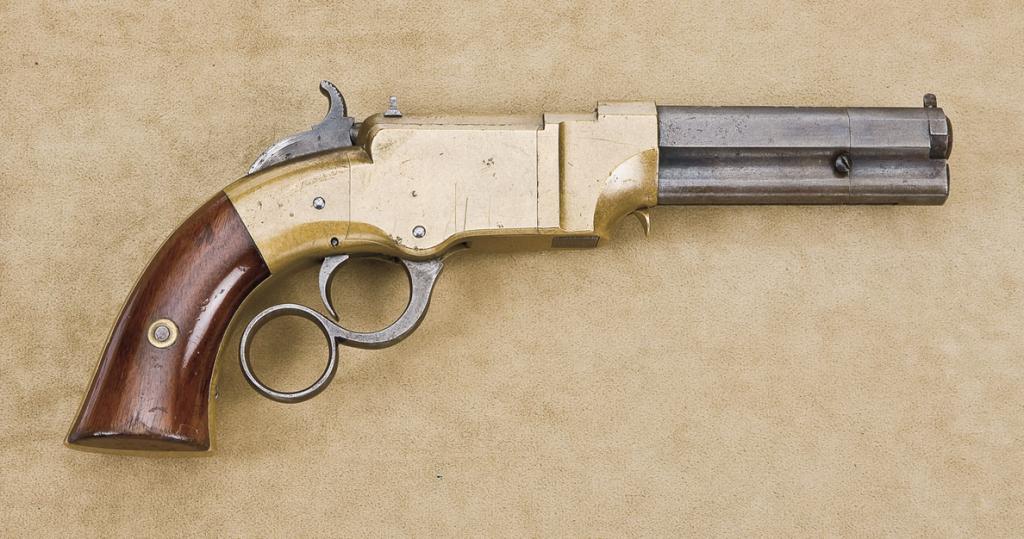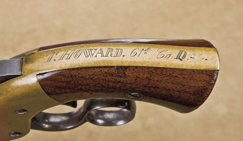 Inscribed Volcanic lever action pistol, .31 cal., 3-1/2” barrel, brass frame, iron barrel assembly, wood grips, #1399. This gun is in overall very good condition showing a medium brown patina on the barrel assembly and a pleasing taffy colored patina on brass frame with inscription on the backstrap “T. HOWARD 61st. Co. D”; the bore is good, the action very good, the grips are very good with some slight wear and scattered small scratches and mars from carry and storage. Paperwork with this lot from the estate indicates this gun was previously in the collection of Oregon Governor Victor Atiyeh (1979-1987). Also included are copies of his National Archives military and pension records that in summary indicate his service in both the 44th NY State Volunteers and the 61st NY Vols; that he was present at the battles of Chancelorsville and Gettysburg; he ruptured himself while assisting in the building of a road near Snickersville Gap, Virginia and was in and out of active service until the end of the war. A really good quality small Volcanic pistol with Civil War history. Est.: $5,000-$10,000.