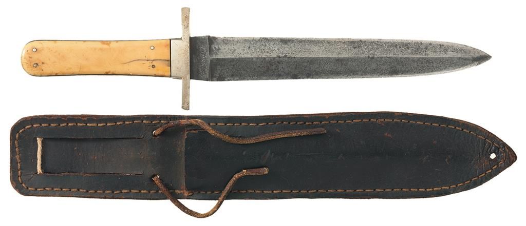 12" overall, 7 3/4" double edge blade, German silver guard, "Jos. P. Brinton/Phila" on a silver panel on the grip. With leather sheath. Fair.