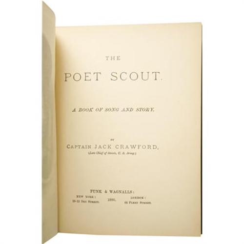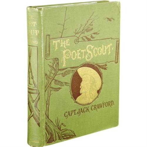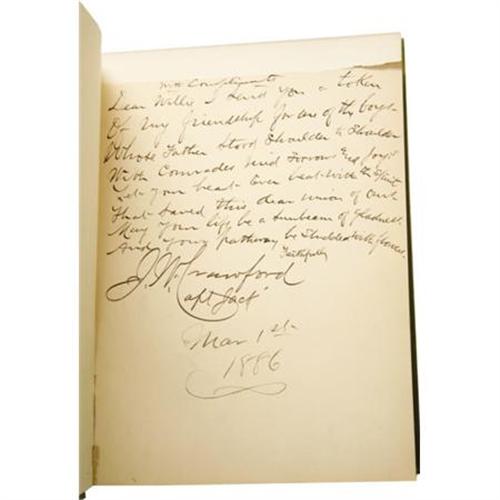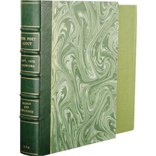 <B>Captain Jack Crawford John Wallace : An Excellent Inscribed Copy of <I>The Poet Scout. </B></I></B></I><B> A Book of Song and Story.</B></I> By Captain Jack Crawford, (Late Chief of Scouts, U.S. Army). (New York and London: Funk & Wagnalls, 1886). First edition thus, with expanded contents from the 1879 publication with the same title. With a warm ten-line inscription by Crawford to “Willie” on a preliminary leaf and signed: “J.W. Crawford; Capt. Jack.” Square octavo (7.5” x 6”). 181, 6, publisher's catalog pp. Illustrated. Publisher's very attractive green cloth decoratively stamped in gilt and dark brown, edges stained green, floral endpapers. Light rubbing around the edges, front hinge cracking with evidence of repair, tear to bottom of front free endpaper and page with inscription is shortened at the top by tearing away a horizontal strip, small fore-edge tear to frontispiece not affecting portrait, else a beautiful, very good copy. Housed in a custom quarter morocco book-backed slipcase with five raised bands and gilt tooling and lettering on the spine. Crawford, an Irish-born American scout and poet, and a friend of Buffalo Bill, was one of the most picturesque figures in American literary life. As a young boy he ran away and enlisted in the Army and fought in the Civil War, serving with distinction although he was severely wounded. While recovering, he learned to read and write, and soon began a prolific stream of verse, stories and plays of the West. Before publishing this book, he had earned his title by serving as a Government scout under General Crook in the Sitting Bull and other Indian Campaigns.<BR><BR><b>Shipping:</b> Books & Catalogs (<a target="_blank" href="http://www.heritageauctions.com/common/shipping.php">view shipping information</a>)