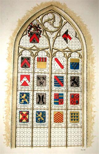 Première série, tomes I & II : églises paroissiales = église de Saint-Martin dite d'Ackerghem (8 pl. et quasi toutes les armoiries rehaussées de couleurs),- église de Saint-Sauveur (4 pl.),- église de Saint-Michel (13 pl. dont 1 sur double page), église de Saint-Jacques (5 pl.),- église de Saint-Nicolas (3 pl. et une table des noms de famille dactylographiée),