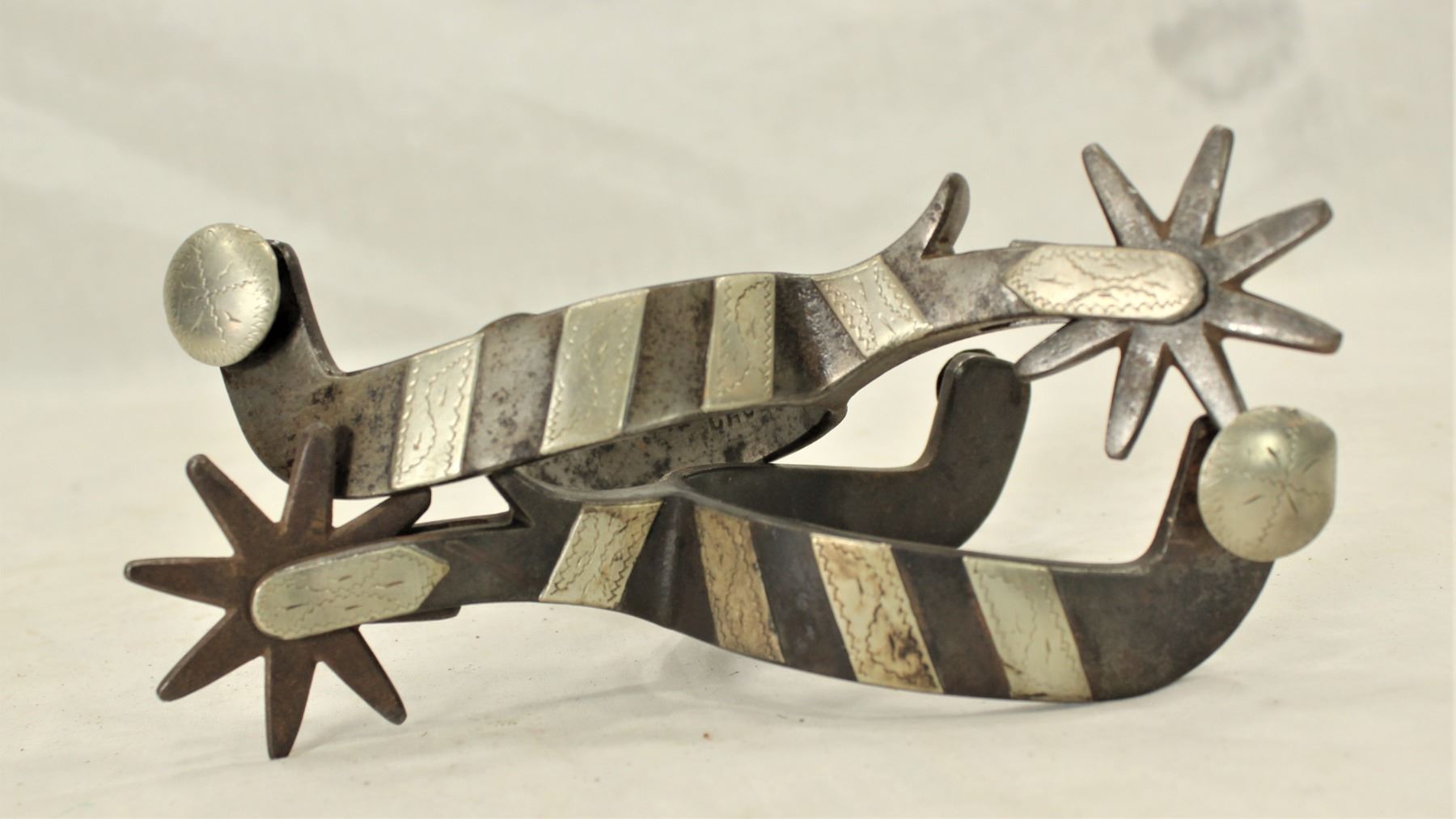 A large pair of single mounted spurs in the Laredo #107 pattern, with large 9 point rowels.