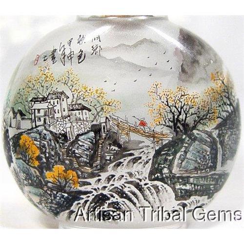 Crystal Inside Painting Snuff Bottle Landscape Garden of Eden... Inside painting at it's finest! A stunning portrayal of an inviting mountainous paradise landscape on both sides. Magnificent waterfalls complimented by autumn shades. The details are phenomenal. Simply an awesome creation worthy of the most seasoned collector's attention. The bottle has measurements of 72mm in height, 60mm in width with a depth of 30mm. For those not familiar with metric 25mm=1". Gram weight is 57.7. Worthy of serious consideration.