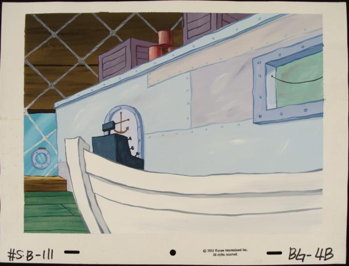 This original hand-painted background from the Nickelodeon TV show SpongeBob Squarepants. The story takes place under the deep blue sea in Bikini Bottom, where SpongeBob resides. SpongeBob, who is a yellow, porous sponge, is your typical happy-go-lucky character, as he is always cheerful and enjoys making people laugh. Patrick Star, SpongeBob's neighbor who is a starfish, is your average children's show idiot, as he boasts knowing nothing and is often getting himself into ridiculous situations. Between the homes of these two lies the home of the miserable Squidward, a squid, who is known for being grouchy and playing tricks on SpongeBob and Patrick. Both SpongeBob and Squidward work at the Krusty Krab, a fast food business run by the greedy money-loving Mr. Krabs, a crab, the arch rival of the evil, possibly misunderstood, Plankton. Another neighbor, Sandy Cheeks, an athletic squirrel who normally wears an astronaut's space suit, was introduced in "Tea at the Treedome." She spends most of her time inventing and experimenting. This is inside the Krusty KrabsOriginal Production Background Overall Size of Background: 10 1/4" x 13 3/4" Very good conditionOriginal Production Backgrounds are used in the making of the final version of animated productions. The background establishes the location and the overall good mood of the scenee. Typically, a background layout artist creates a drawing to establish the content of the scene, placement of characters, perspective and camera angle. Based on this drawing, the background artist creates a preliminary painting to confirm all of the scenes details, then the final production background which is used in the filming of the scene. When these backgrounds are individually photographed behind the progression of production cels, and projected at a rapid succession, the images in the foreground appear to move, creating an animated scene. The background is ready to be matted and framed. It is a colored background with the animator's notations at the bottom.