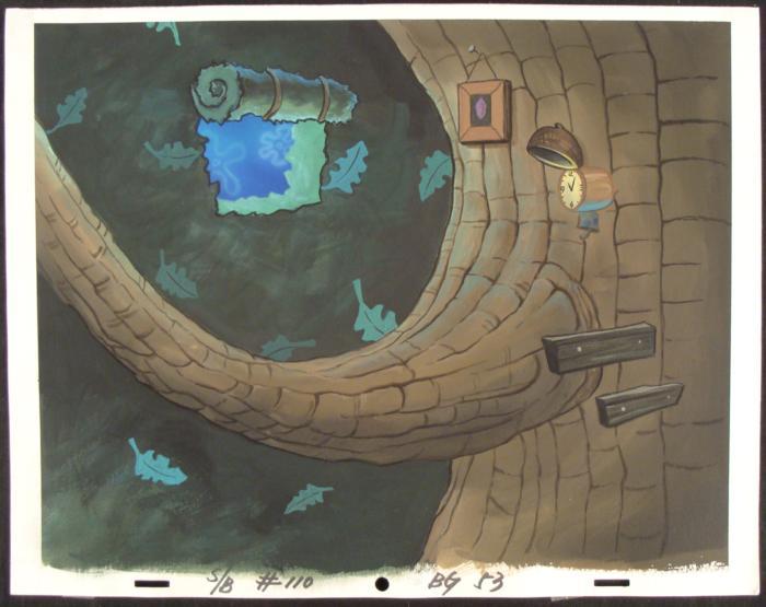 This original hand-painted background from the Nickelodeon TV show SpongeBob Squarepants. The story takes place under the deep blue sea in Bikini Bottom, where SpongeBob resides. SpongeBob, who is a yellow, porous sponge, is your typical happy-go-lucky character, as he is always cheerful and enjoys making people laugh. Patrick Star, SpongeBob's neighbor who is a starfish, is your average children's show idiot, as he boasts knowing nothing and is often getting himself into ridiculous situations. Between the homes of these two lies the home of the miserable Squidward, a squid, who is known for being grouchy and playing tricks on SpongeBob and Patrick. Both SpongeBob and Squidward work at the Krusty Krab, a fast food business run by the greedy money-loving Mr. Krabs, a crab, the arch rival of the evil, possibly misunderstood, Plankton. Another neighbor, Sandy Cheeks, an athletic squirrel who normally wears an astronaut's space suit, was introduced in "Tea at the Treedome." She spends most of her time inventing and experimenting. Here is a look at the inside of Sandy's Treedome. Original Production Background Overall Size of Background: 10 1/4" x 13" Very good condition; it has been stored Original Production Backgrounds are used in the making of the final version of animated productions. The background establishes the location and the overall good mood of the scenee. Typically, a background layout artist creates a drawing to establish the content of the scene, placement of characters, perspective and camera angle. Based on this drawing, the background artist creates a preliminary painting to confirm all of the scenes details, then the final production background which is used in the filming of the scene. When these backgrounds are individually photographed behind the progression of production cels, and projected at a rapid succession, the images in the foreground appear to move, creating an animated scene. The background is ready to be matted and framed. It is a colored background with the animator's notations at the bottom.