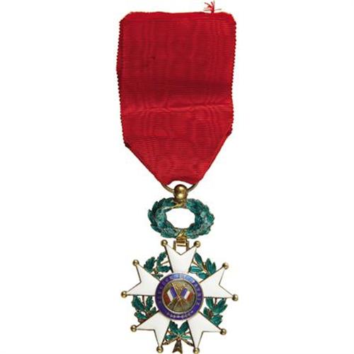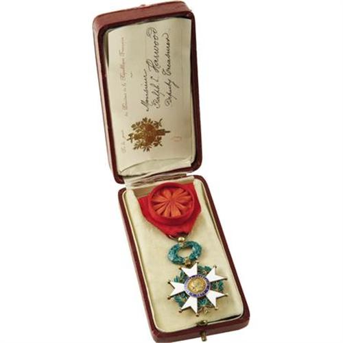 <B>Insignia, Officer of the Legion of Honor, Republic of France</B></I>, in gold and enamels, made by Arthur Bertrand of Paris, in the original fitted case. In fine condition. Presented to Harwood by President Gaston Doumergue of France. Also included is the original bestowal document to Ralph Endersby Harwood, one partially printed pages page, 22" x 17.25", Paris, May 10, 1927 and the Buckingham Palace document signed by Sir Frederick Ponsonby informing Harwood that King George V has granted permission to wear the Legion of Honor, 8" x 13", London, May 25, 1927.<BR><BR><BR><b>Shipping:</b> Miscellaneous Collectibles, Larg (<a target="_blank" href="http://www.heritageauctions.com/common/shipping.php">view shipping information</a>)