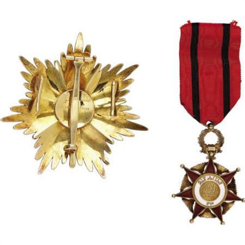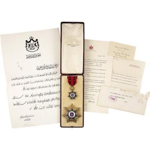 <B>Insignia of the Order of Al Rafidain (2nd Class), Kingdom of Iraq,</B></I> in silver, gilt, and enamels, made by Arthur Bertrand of Paris, in the original fitted case. Marked Arthur Bertrand, Paris on the reverse. Slight enamel loss, else fine condition. Also included is the original bestowal document to Ralph Endersby Harwood, with the signature of King Faisal I of Iraq, four integral partially printed pages written on page one, 10.5" x 17" [June 1933]; transmittal letter from the Privy Purse Office, March 22, 1937; and the Buckingham Palace document signed by Sir Frederick Ponsonby informing Harwood that King George V has granted permission to wear the Order of Al Rafidain, 8" x 13", London, July 18, 1933.<BR><BR><b>Shipping:</b> Miscellaneous Collectibles, Larg (<a target="_blank" href="http://www.heritageauctions.com/common/shipping.php">view shipping information</a>)