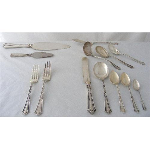 International Silver Company Flatware set c1915 in the "Westminster" Pattern, consisting of 12 X 9.1/4" Dinner Knives with silver plated blades and sterling handles. 6 are monogrammed with an "S" and six are NOT monogrammed. 12 X 7.1/2" Dinner Forks that are solid silver with NO monogrammes. Six X 7" Salad Forks that are solid silver and monogrammed with an "S". Six X 7.1/4" Round Soup Spoons, solid silver with an "S' Monogramme. 4 X 6" Teaspoons with NO monogrammes. 7 X 5.1/2" 5 o'clock spoons, 3 have NO monogrammes and 4 have a "W" monigramme. 6 X 4.1/8" Demitasse spoons with an "S" monogramme. 1 X 5.3/4" preserve spoon with an "S" monogramme. 1 X 6" cream ladle with an "S" monogramme. 1 X 7.1/2 ' Master butter knife. 1 X 6.1/8 Petit Four Server with NO monogramme. 1 X 10.1/2" Pie Server with a sterling handle marked, "Sterling with Plated details" and a silver plated blade. There is normal wear to this elegant set.