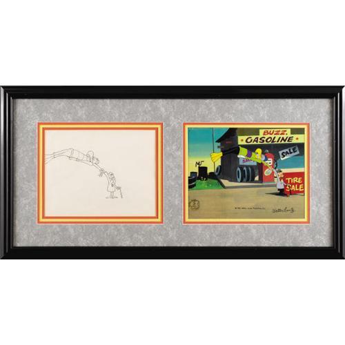 <B>Inspector Willoughby and Buzz Buzzard Preliminary and Production Cel Animation Original Art (Walter Lantz, 1987).</B></I> Tough guy Buzz tangles with the wrong mild-mannered Inspector, as Willoughby nonchalantly tosses the buzzard to and fro! A 9" x 12" penciled preliminary drawing is matched with a painted cell and combined with a color background featuring the "Buzz Gasoline" station; both are matted and framed in a handsome presentation that measures 34.25" x 17.5". All are in Excellent condition; the painted cel is signed in ink by Walter Lantz.