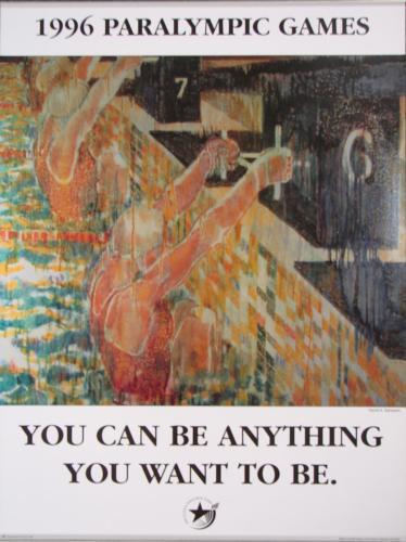 This handsome poster - with artwork by David Sampson - was created for the Paralympic Games in Atlanta in 1996:Title: "You Can Be Anything You Want To Be" 18 × 24 Excellent condition; has been stored rolled; never mounted, matted or framed This from the Paralympics very informative web site: "The Paralympics are elite sport events for athletes from six different disability groups. They emphasize, however, the participants' athletic achievements rather than their disability. The movement has grown dramatically since its first days. The number of athletes participating in Summer Paralympic Games has increased from 400 athletes from 23 countries in Rome in 1960 to 3806 athletes from 136 countries in Athens in 2004."
