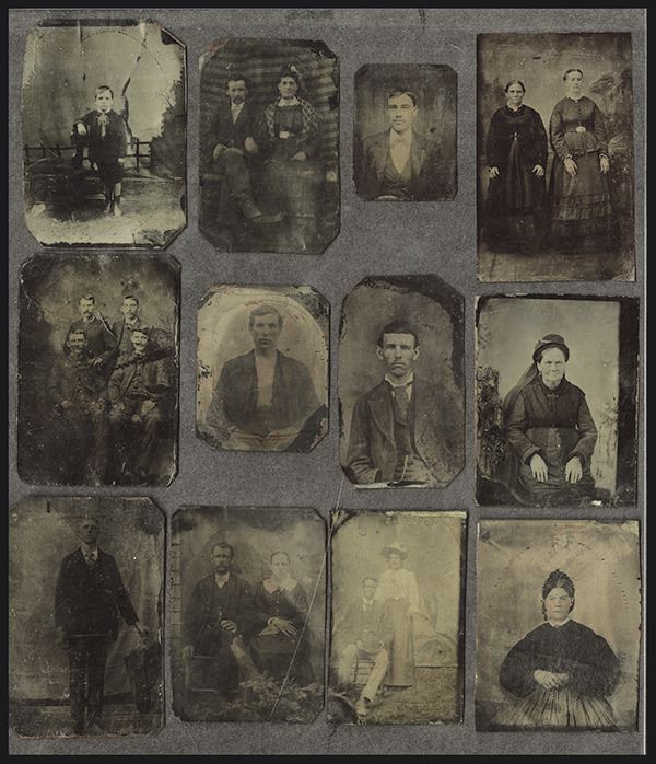 Tintypes. Removed from holders. Images of couples, men, children. Some damaged, some with old frame marks. Now all loose. Non identified, some with old price stickers. Group of 13 pieces.