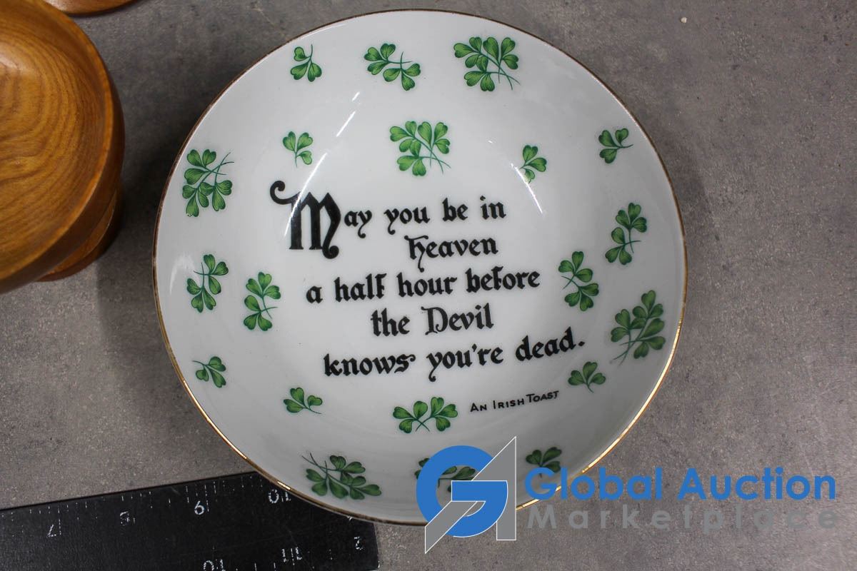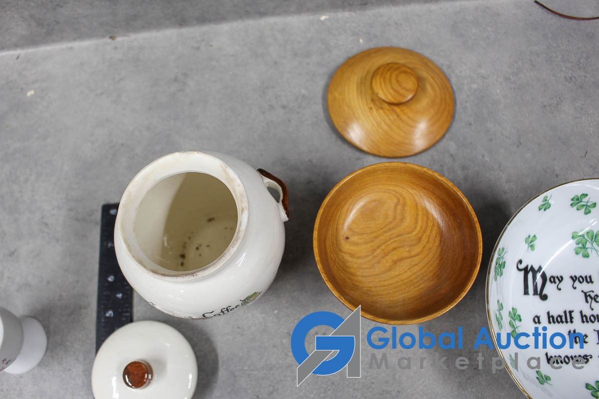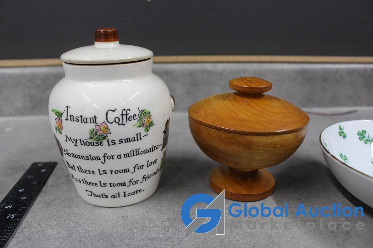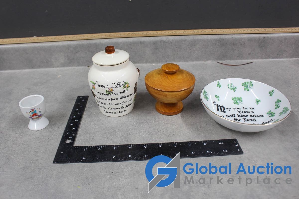 Instant Coffee Container, Irish Bowl, Egg Cup and Wooden Container
