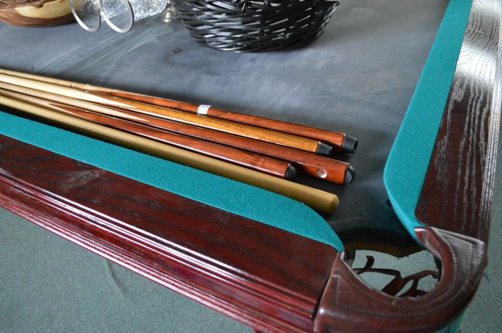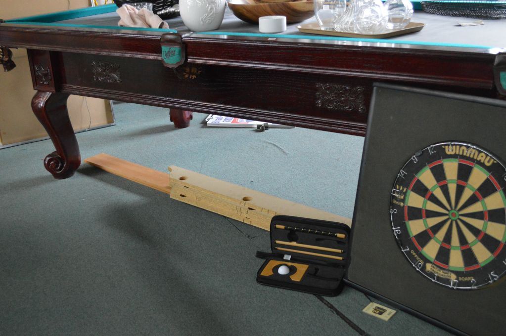 Instant Games room including Dufferin oak framed antique style, three piece slate pool table with cues, plus a dart board and a Donald Trump cased putter set