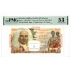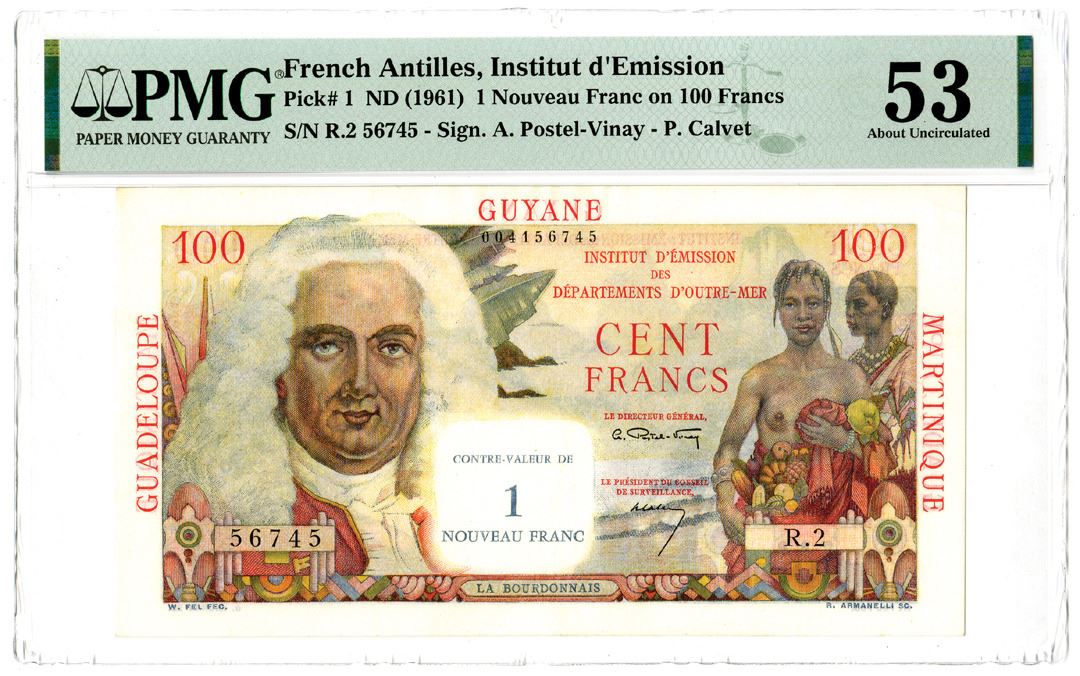 French Antilles... ND (1961). 1 Nouveau Franc on 100 Francs, P-1a, Issued Banknote. Red printing on m/c underprint with portrait of La Bourdonnais at left. S/N R.2 56745 with watermark of women's head at bottom. PMG graded About Uncirculated 53. (From the Allen Berk Collection)