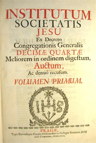 Institutum Societatis Jesu ex Decreto Congregationis Generalis Decimae Quartae [...]. Pragae [ Prague], Typis Universitatis Carolo-Ferdinandeae in Collegio Societatis Jesu ad S. Clementem, 1705. 2 vol. in-f° : [4]-714, [2]-349-[154] pp. + index propres non paginés reliés après chaque chapitre. Rel. de l'époque : plein veau jaspé, dos à nerfs, fleurdelisés, dorés, pièces de titre et de tom. (faibles us., manque à une coiffe).