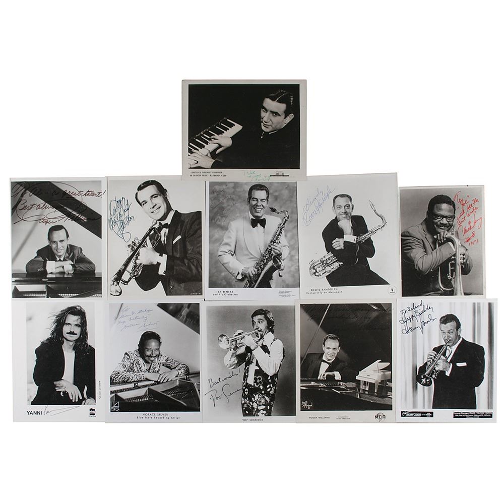 Lot of 11 photos individually signed by a noted instrumentalist, ranging in size from 6.75 x 9 to 8 x 10, with some inscribed: Ray Anthony, Tex Beneke, Harry James, Boots Randolph, Raymond Scott, ‘Doc’ Severinsen, Horace Silver, Clark Terry, Roger Williams (2), and Yanni. In overall fine condition, with some light wear and creases.