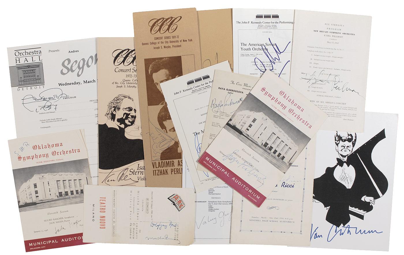 Twenty concert programs, ranging in size from 5.5 x 9 to 9 x 12 and dating from the 1940s to the 1980s, each individually signed on the cover or inside by many of the leading instrumentalists or conductors of the 20th century. Pianists are: Vladimir Ashkenazy, Van Cliburn (signed caricature), Andre Watts, Jack Maxim; Violinists are: Mischa Elman (with Wolfgang Rose), Henryk Szeryng, Isaac Stern (2), Ruggiero Ricci, Itzhak Perlman (2), Eugene Fodor; Cellists are: Gregor Piatigorsky, Raya Garbousova, Dmitri Markevitch, Kermit Moore; Guitarist Andres Segovia; Conductors are: Lorin Maazel, James Levine, Zubin Mehta, and Valery Gergiev. In overall very good to fine condition.