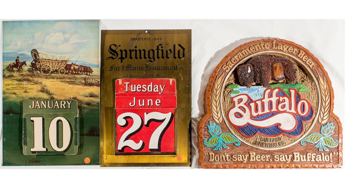 1949 This lot contains two vintage Springfield Fire & Marine Insurance Company metal calendars. Both have a holder month and day cards dates for a perpetual calendar. There are a few of these surviving cards included with both. The pioneer themed Conestoga piece measures 19" tall by 12.7/8" wide. The holder slot is approx. 7.1/4" wide by 5" tall. The sign features a print by W. McCallum Hogg and is dated 1949. The brass calendar with black lettering measures 12’x 18” and has a 6”x 8” card holder. This too has some cards for the slot. There is some staining, but all and all, it’s an attractive wall hanger. Finally, we have a 1970’s era Buffalo Beer sign, ready to hang in your saloon or party room. This colorful sign appears to be made from plaster and measures 17”x 18” and has a few chips out of it that add character. This is a nice and very unique group. Fairbanks Collection - HKA#65205