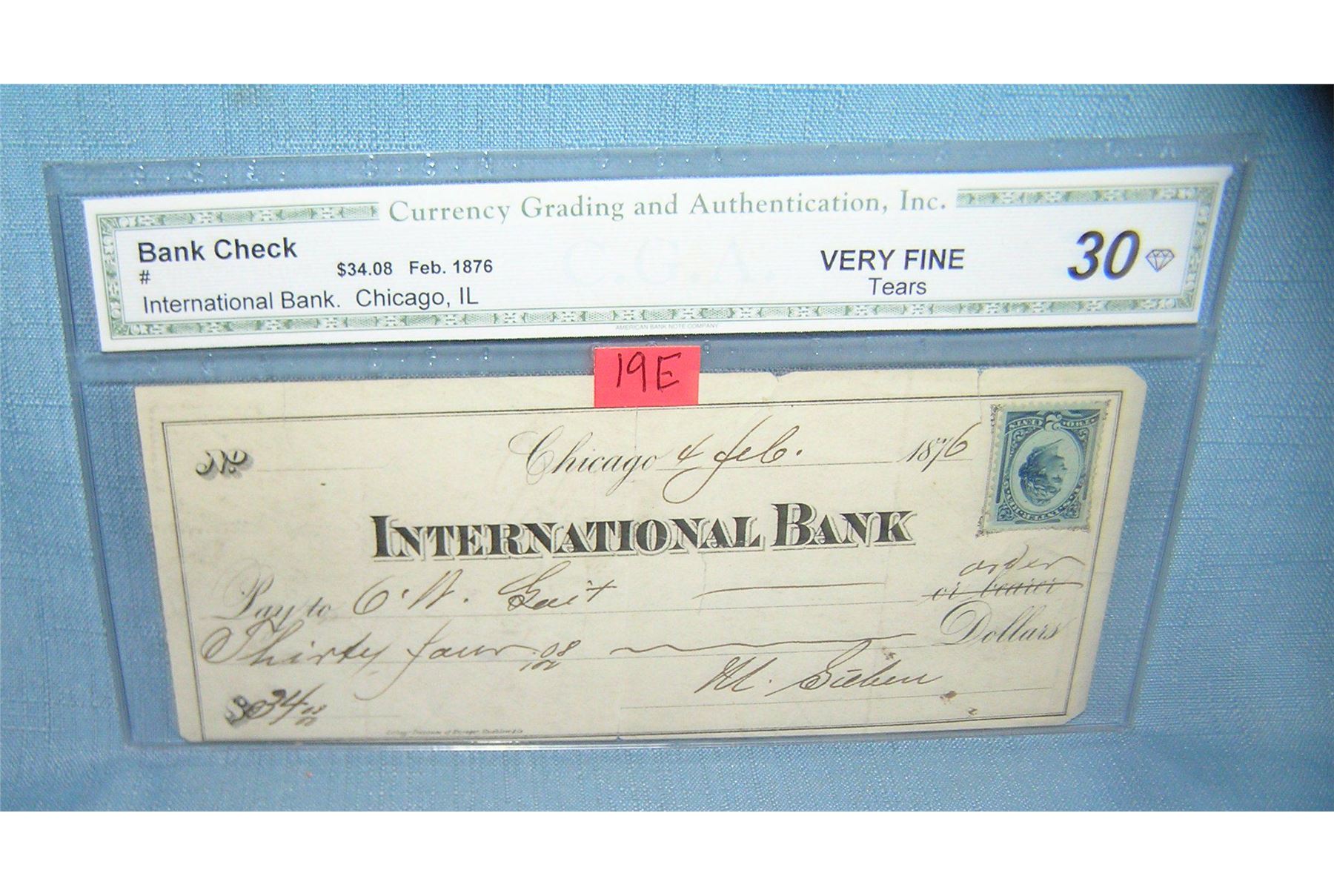 International Bank of Chicago bank check with period 2 cent stamp check dated February 1876 graded very fine est. value $50.00-$65.00