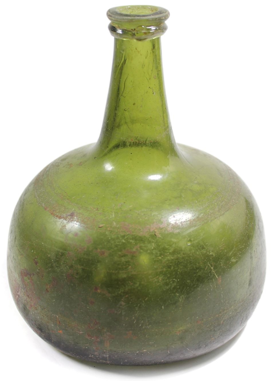Intact "onion" bottle, 1700s. 945 grams, 6-1/2" tall x 5-1/2" diameter. Pale-colored "black glass" bottle, a little heavier than most with a less-bulbous base, many circular wear marks from use, but completely intact. Pedigreed to the Stuart Auerbach collection (see lot 4).