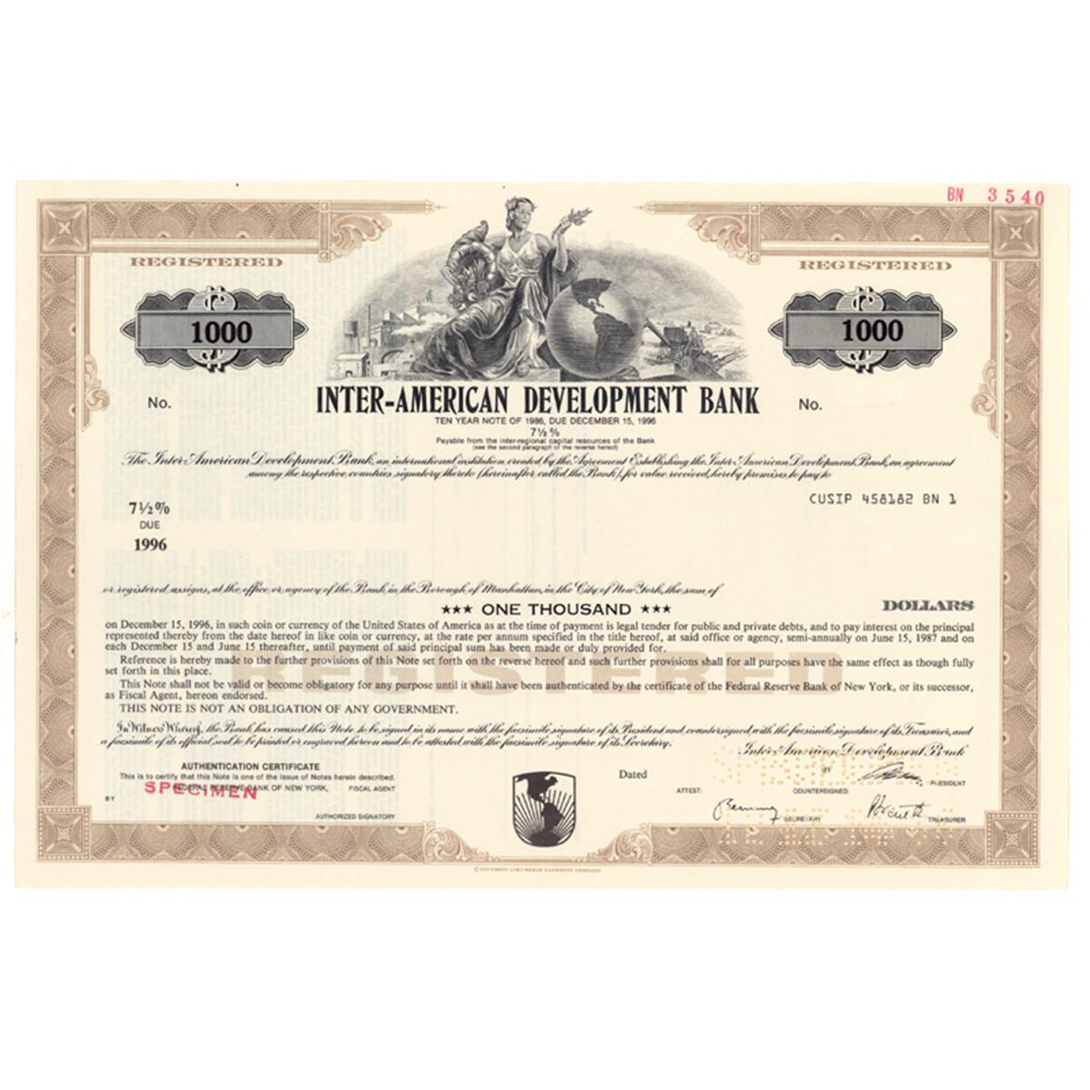 [SPECIMEN] ----, New York. 7 1/2% ten year note specimen in Inter-American Development Bank. Brown / Black. Vignette of an allegorical female holding a horn of plenty with a factory and farmland in background at top center. Perforation cancellation at signatures. Very Fine.