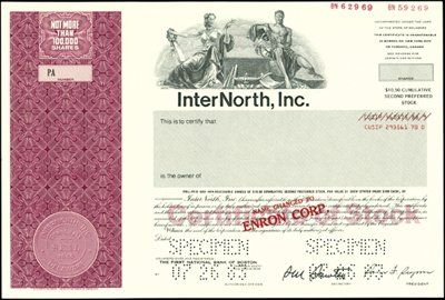 DE. 1983. Specimen. Internorth, Inc. certificates with red overprint "Name Changed to ENRON CORP." Vignette of allegorical man and woman with globe, lamp and wreath. 1) Not More Than 100,000 shares, red border. 2) Not More Than 100,000 shares, brown border variants. Rare varieties of early Enron certificates. SC-USBNC. XF.