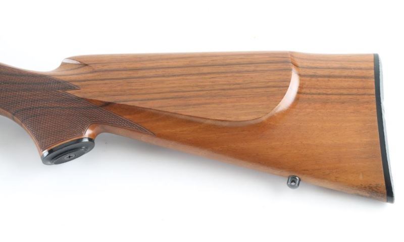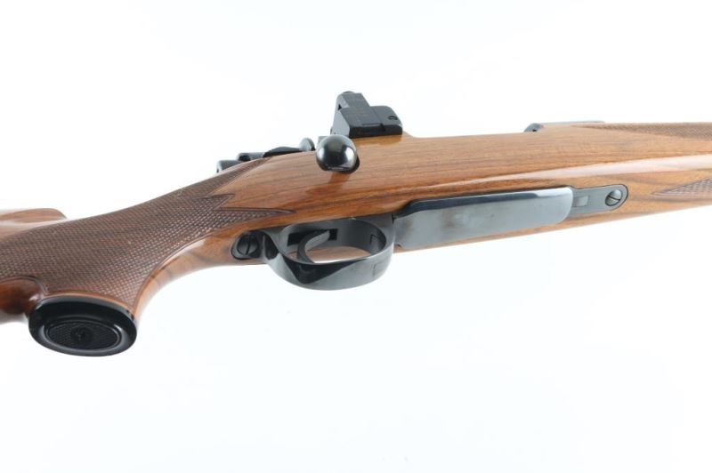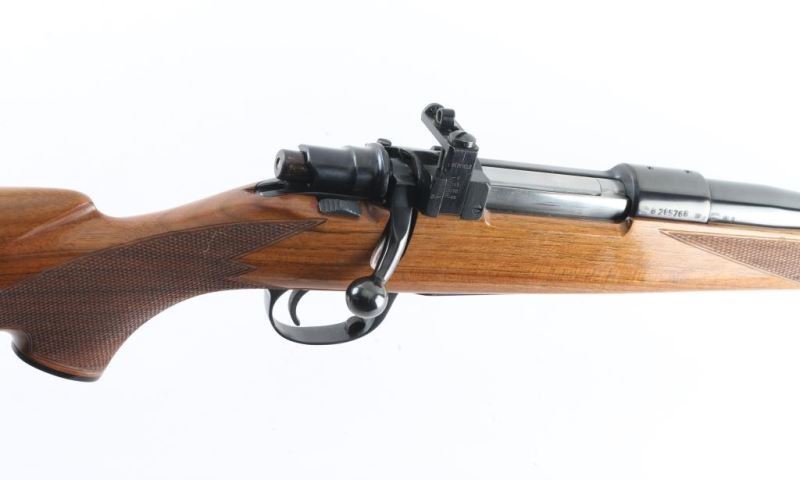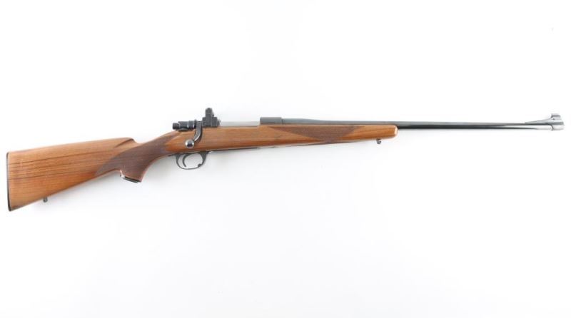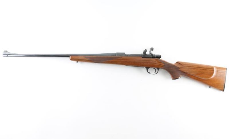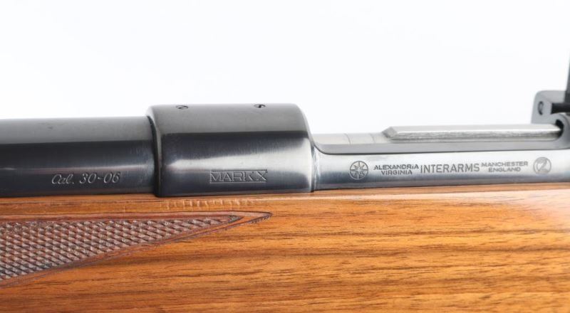 Manufactured in England and imported by Interarms/Alexandria, Virginia. This gun features a controlled round feeding action and a 24" blued barrel. It sports a Lyman front sight with a Redfield fully adjustable rear peep sight. It has a hinged floorplate, a sliding manual safety on the right side of the tang and a serrated trigger. Wood stock is in very good condition with the only bad spot a small scratch on the left side above the trigger and rubbing at the toe. Checkering at the wrist and wrap around on the forend. It has swivel studs, a black plastic grip cap and Interarms butt plate. The bluing looks great as does the entire gun. Condition: NRA Very Good
