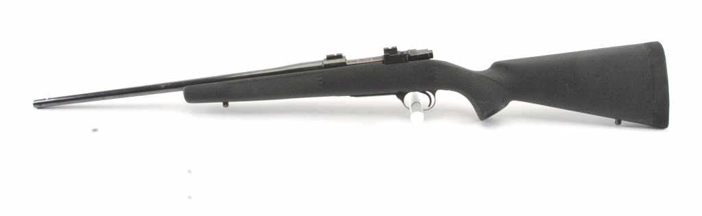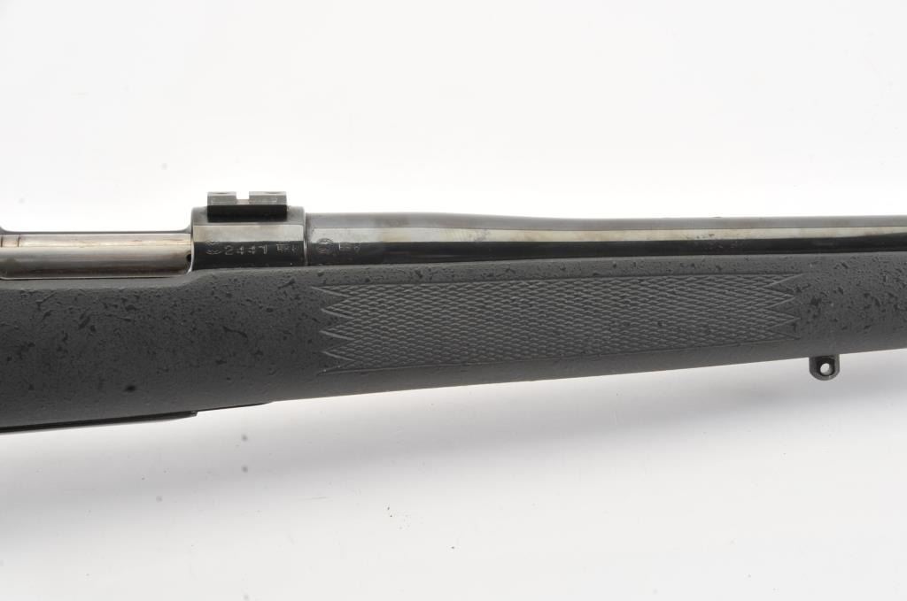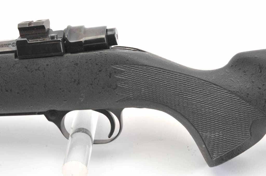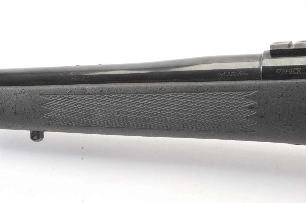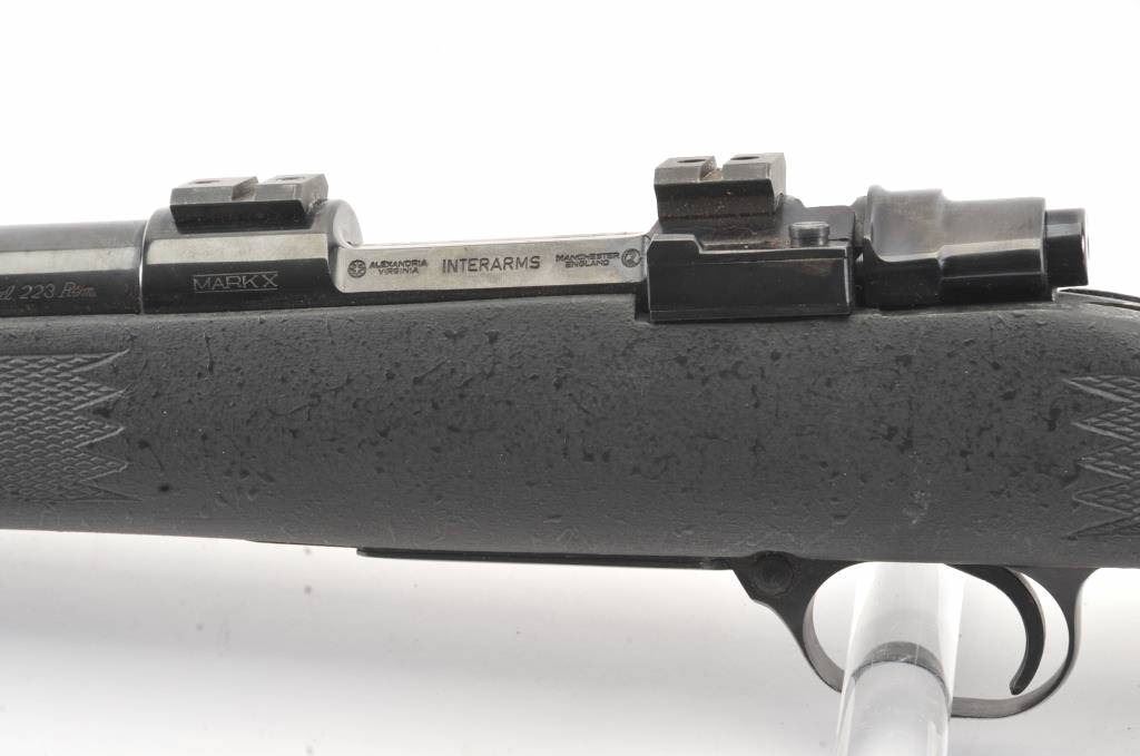 Interarms Mark X bolt action rifle, .223 Remington caliber, Serial #2441. The rifle is in good overall condition with a 20” barrel. The metal surfaces retain the majority of their blue finish with the frontand rear sights removed, numerous English proofs and acceptance marks at the front ring and Weaver bases added. The action is not functioning at the time of description and should be inspected by a competent gunsmith. The Bell & Carlson textured synthetic stock is in very good condition showing little use. The bore is dirty and may clean to good. Est.: $300-$600. (Modern).