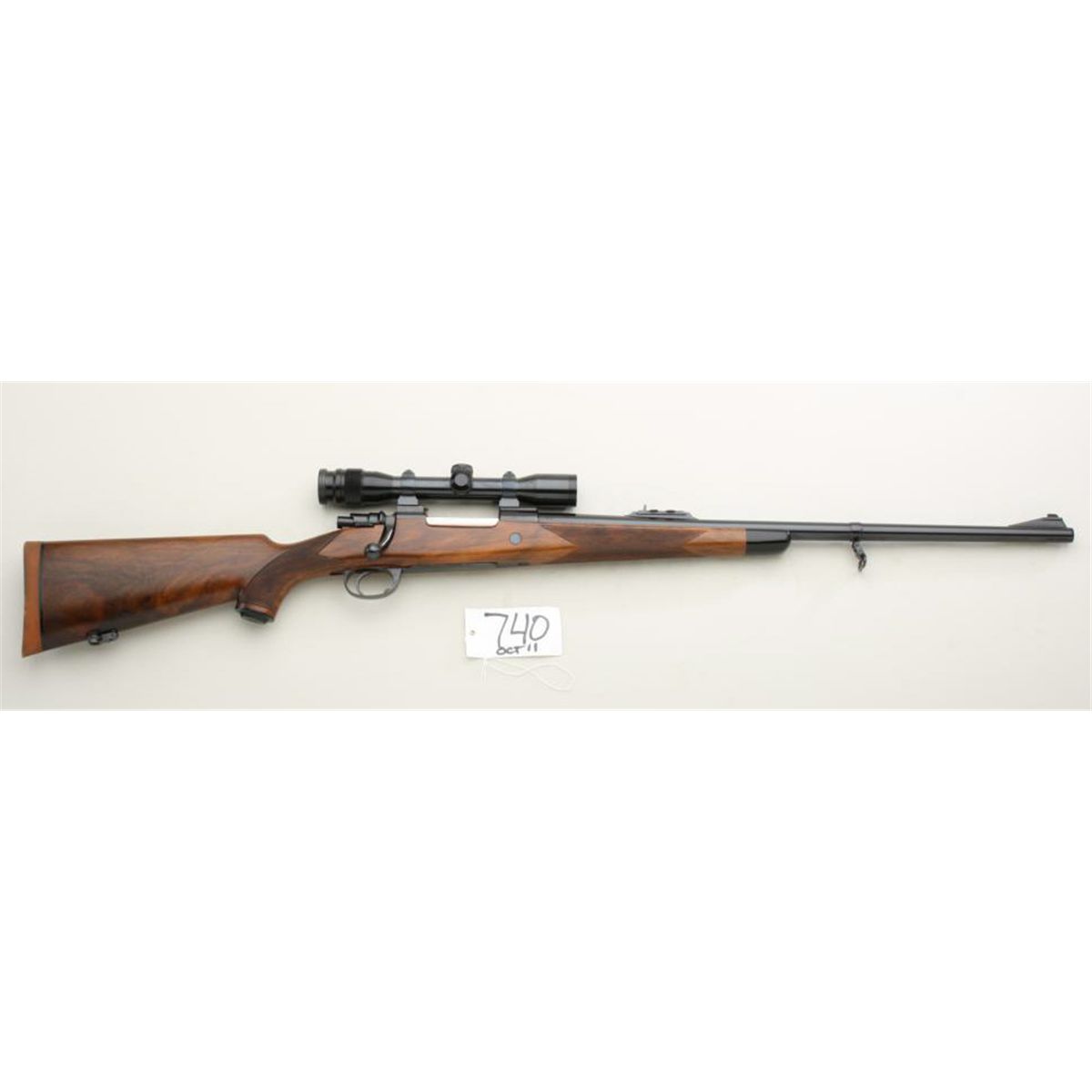 Interarms Mauser action rifle, .375 H&H Magnum caliber, 24” heavy round barrel, barrel marked Whitworth Rifle Company, Manchester, England. Mounted with three-leaf folding rear sight. Action marked WhitworthExpress Rifle. Nicely checkered in select walnut stocks, quick detachable sling swivels, mounted with Swarovski 4x Nova scope on quick detachable rail mounts. Fine to excellent used condition. Some firing andminimal use, 95-98%. From the Robert Petersen collection. Est: $1,000 - $2,000