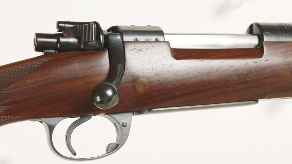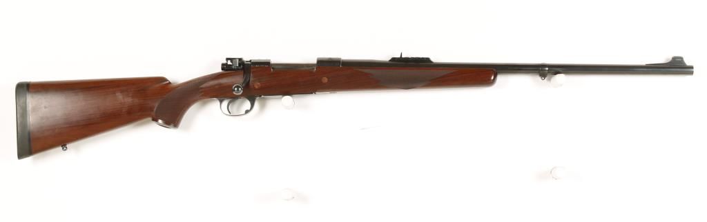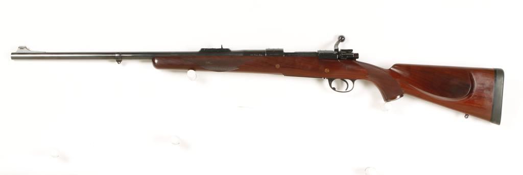 Custom made bolt action safari grade large bore sporting rifle with 24" barrel. Made by C.P. Donnelly from Grants Pass, OR. Blued finish, custom checkered pistol grip stock made from beautiful exotic wood, safari style flip up rear sights to 300 yards and thick rubber recoil pad. Excellent bore and action. Includes partial box(17 rounds) of Federal Premium ammo. Consigner states over $3250 invested. Condition: Very good to excellent showing light handling. *Modern Firearm*