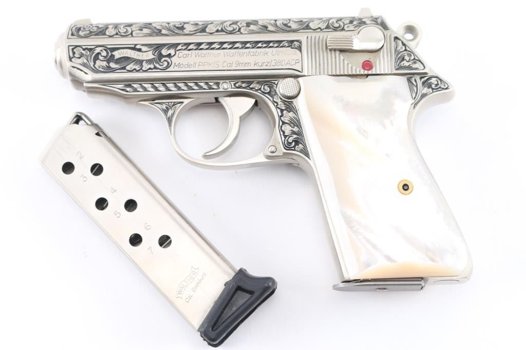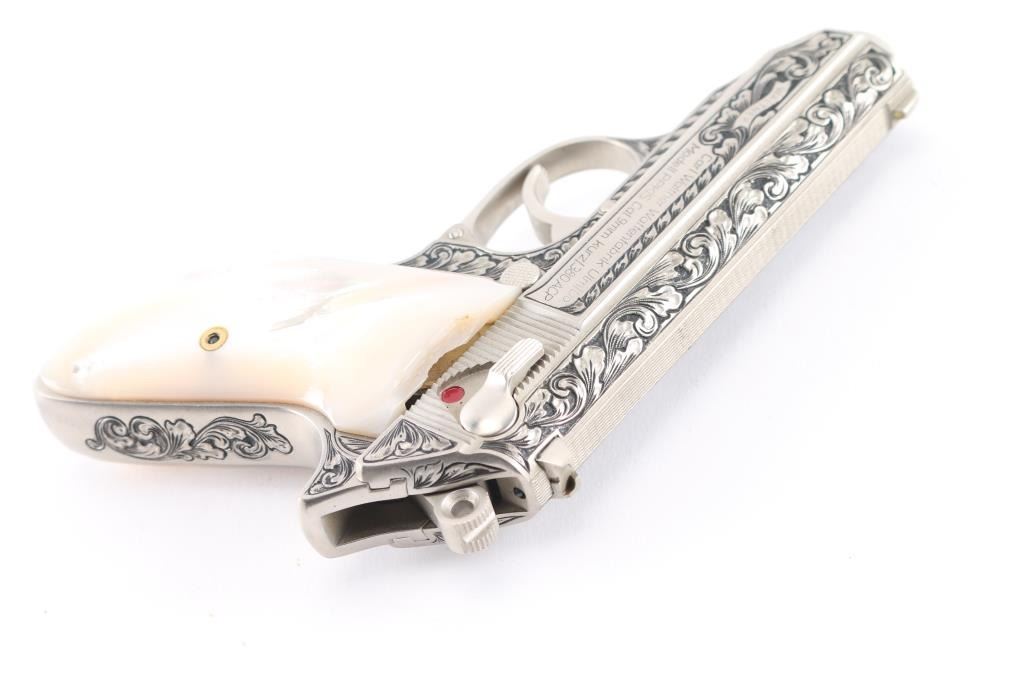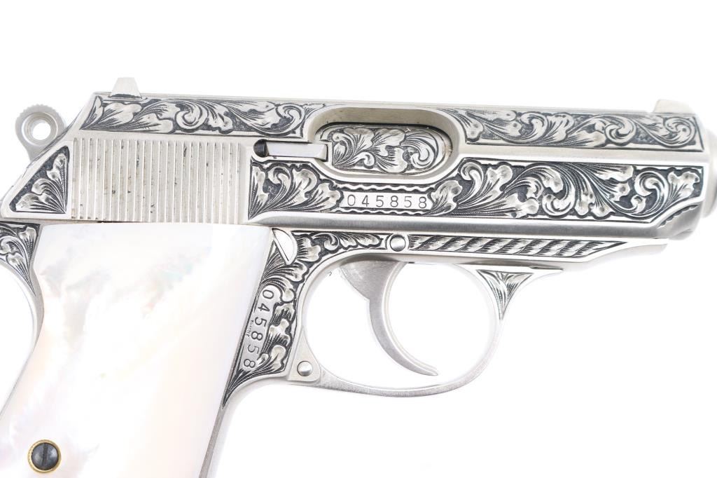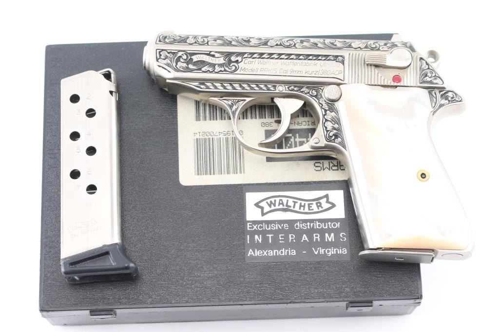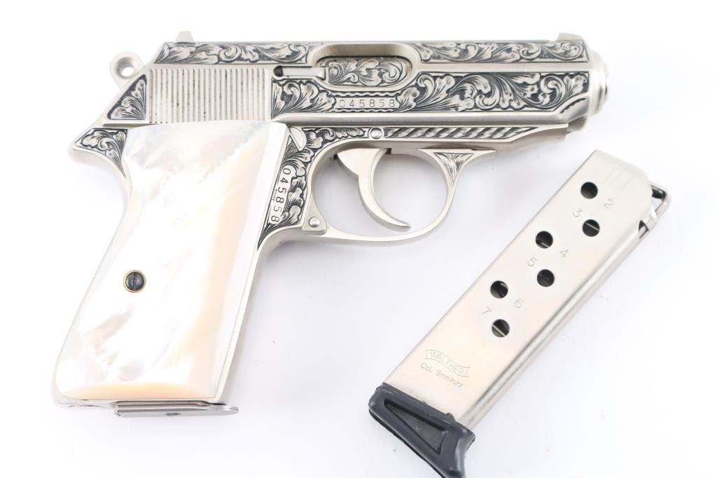 Post War semi-automatic compact pistol manufactured by Interarms under license of Walther. Subsequently engraved & signed by late Master Engraver Ben Shostle. Features an antiqued silver finish with full coverage deep relief scroll engraving, double action trigger, 3.3" barrel, fixed front sight with white dot, dovetailed rear sight with square notch, serrated trigger, serrated round hammer spur, thumb safety/decocker on the left side of the slide, loaded chamber indicator on the rear of the slide, push button magazine release, mother of pearl grips. Bore is excellent/bright. Finish is excellent. Grips are overall very good with a small chip out of the left panel. Includes the original factory hard plastic box with matching label, total of (2) magazines (One finger rest type, one flat bottom). Magazines are 7 rd Walther factory. No visible proofs.