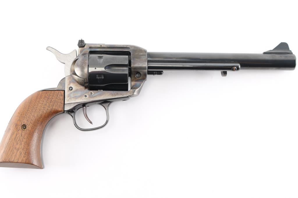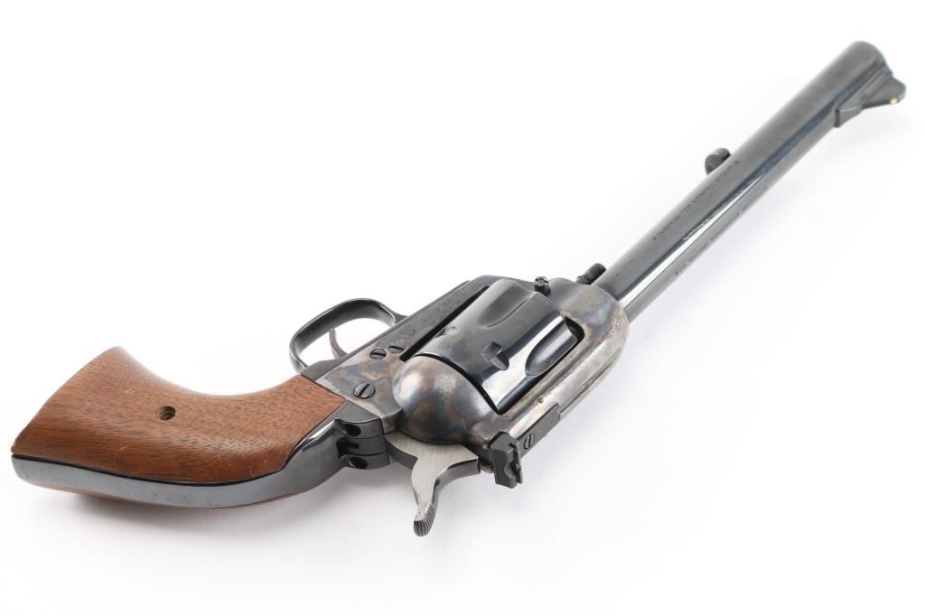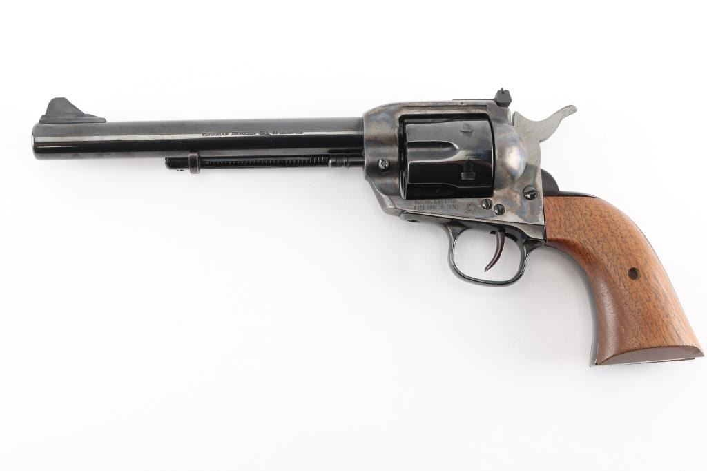 SN: 15802. Interarms Virginian Dragoon chambered in .44 Magnum. Based on the classic Single Action Army, the Virginian Dragoon is slightly scaled up to accommodate the .44 Magnum cartridge. While it incorporates a frame-mounted firing pin, the Virginian Dragoon retains the 4-click action of traditional SAA's. "Don't Tread On Me" with snake on bottom of grip frame. Blue finish, case colored frame, 6-shot fluted cylinder, smooth varnished wood grips, 7 1/2" barrel with front raised serrated blade, adjustable square notch rear sights. Bore is excellent/bright, action is smooth/tight, blue is about 98% with minor scratches.