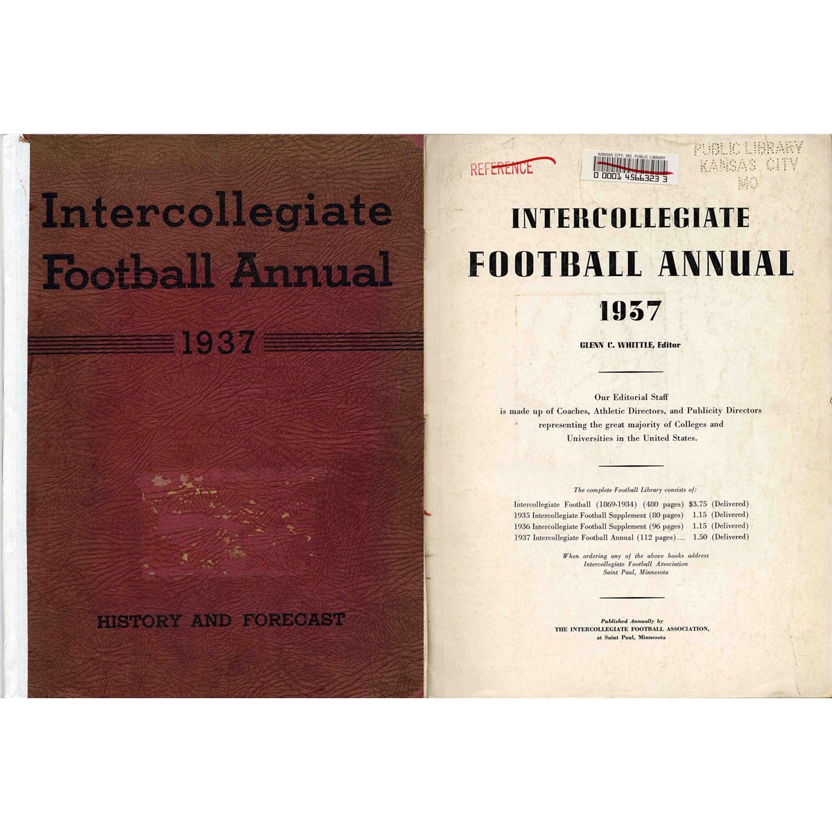 ''Intercollegiate Football Annual History and Forecast 1937'' edited by Glenn Whittle. Saint Paul: The Intercollegiate Football Association: 1937. Ex-libris folio has textured paper boards and runs 112pp., containing many articles concerning contemporary football issues and recent conferences. Book also has several black and white photographs and statistics of 1935 collegiate football stars players such as Joe Kuharich and Cecil Isbell. Binding inexpertly repaired, but tight. Has usual library markings. Overall in excellent condition.
