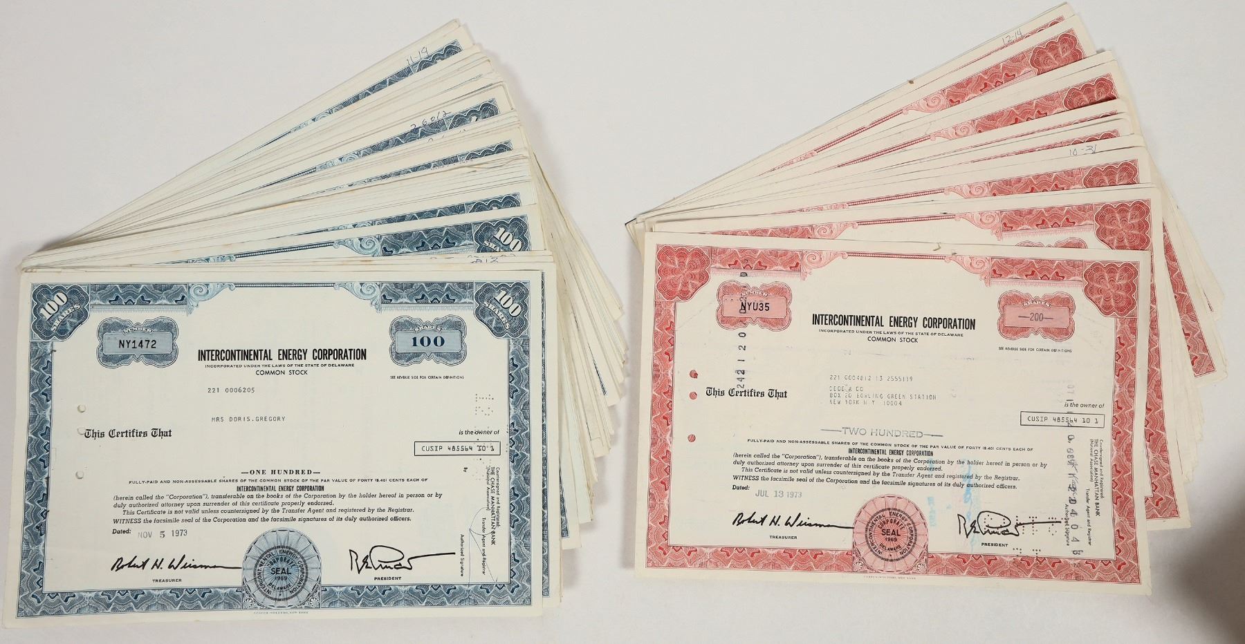 Group of approx. 100 stocks from the Intercontinental Energy Corporation, all issued 1973. Includes red and blue varieties. All issued, all cancelled. 12"x8" certs, all in good condition; see photos.